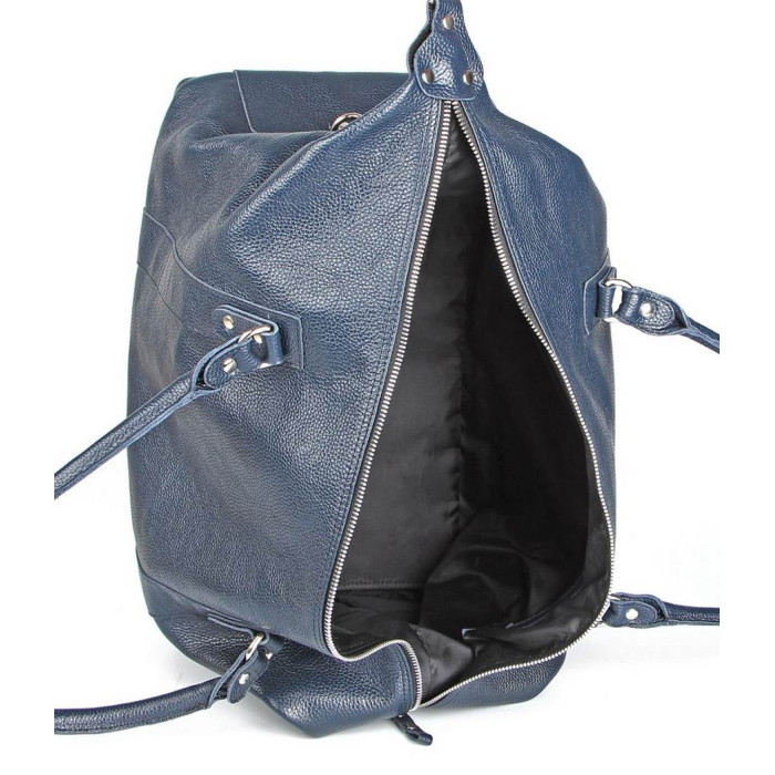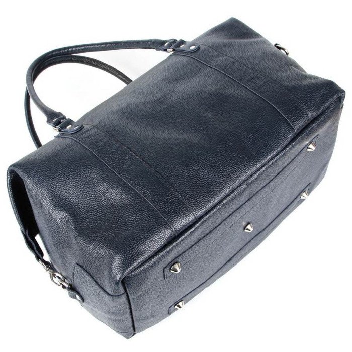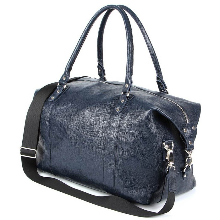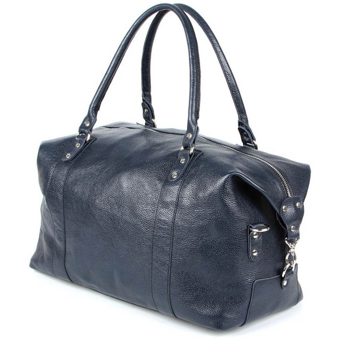 Ексклюзивна дорожня сумка з натуральної шкіри із "зернистою" фактурою. Аксесуар виконаний в темно-синьому кольорі. Колір фурнітури: срібло. Вмісткості такої сумки буде досить для походу в спортзал або нетривалого відрядження. Аксесуар виглядає дуже красиво і дорого, тому він може бути чудовим рішенням для подарунка. Дно сумки захищене металевими ніжками. Виріб упаковано в текстильний пилозахисний чохол.