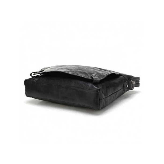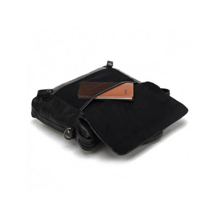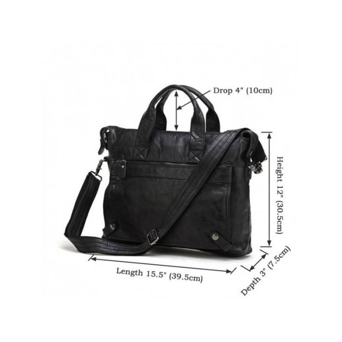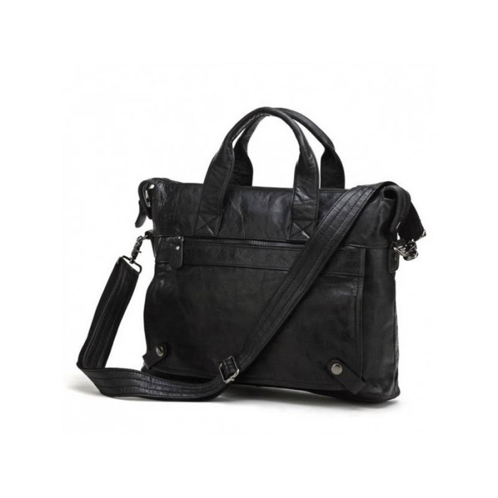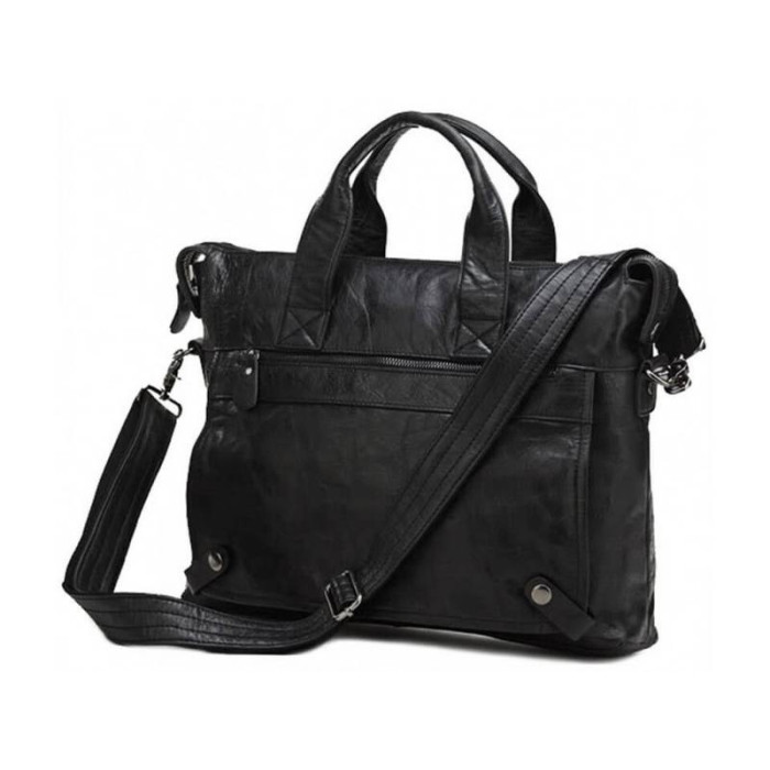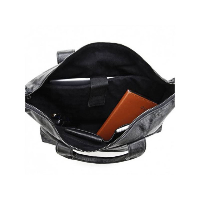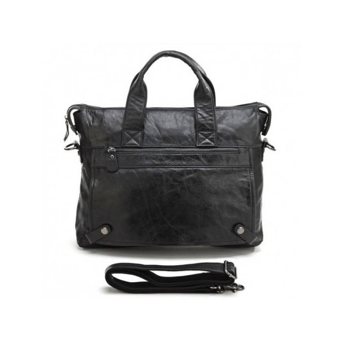 Чоловіча сумка пошита з телячої шкіри глибокого чорного кольору. Така ділова сумка може використовуватися, як сумка під ноутбук. Основний відділ закривається на металеву блискавку. Всередині нього відсік під ноутбук та кишені-органайзери. У відділ з легкістю помістяться книги, папка документами формату А4 та інша необхідна канцелярія. З лицьового боку крім кишені на змійці є відкидний клапан, який фіксується на кнопках. Під ним прихована кішеня відкритого типу. Карман на блискавці з тильного боку гарантує швидкий доступ до документів, ключів або телефону. Для переміщення використовуються дві ручки або плечовий ремінь, який кріпиться за допомогою надійних карабінів.