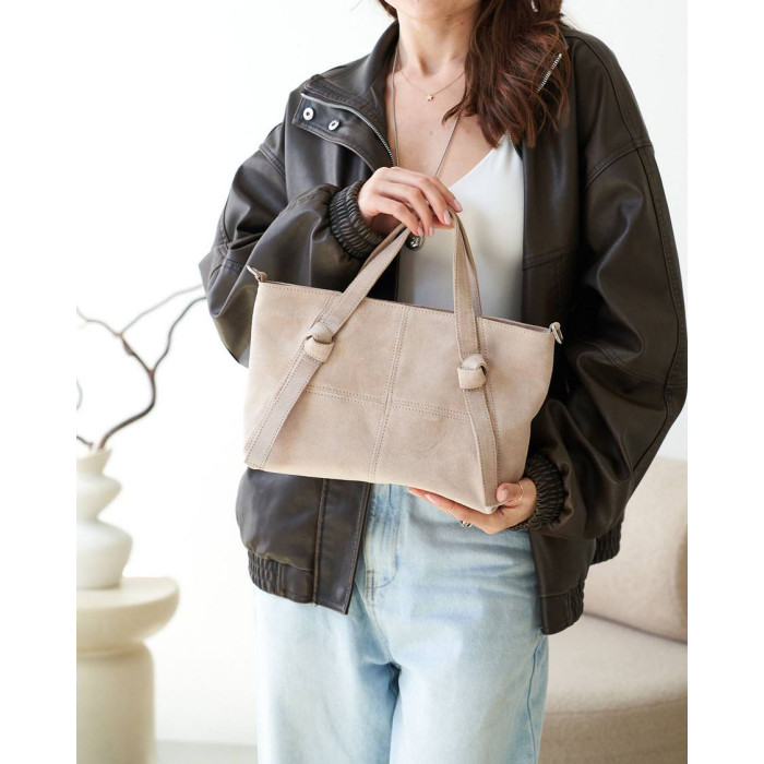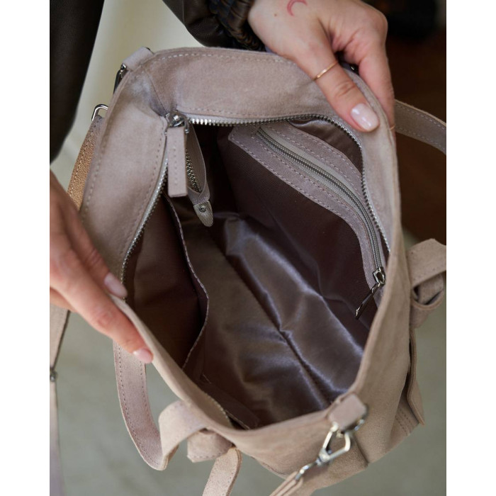 Жіноча сумка K72059, колір бежевий, матеріал сумки натуральна шкіра, замша. Сумка відкривається за допомогою блискавки. Усередині сумка має одну відкриту кишеню та кишеню на блискавці.Сумка має ручку 30 см (від верху сумки).