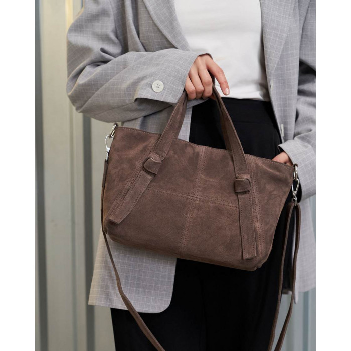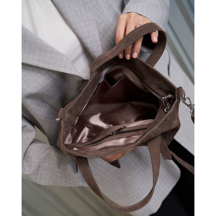 Жіноча сумка K72061, колір капучино, матеріал сумки натуральна шкіра, замша. Сумка відкривається за допомогою блискавки. Усередині сумка має одну відкриту кишеню та кишеню на блискавці.Сумка має ручку 30 см (від верху сумки).