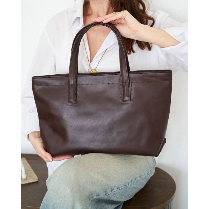 Жіноча сумка K71605, колір шоколадний, матеріал сумки натуральна шкіра, замша. Сумка відкривається за допомогою блискавки. Усередині сумка має одну відкриту кишеню та кишеню на блискавці. Сумка має ручку 15 см (від верху сумки).