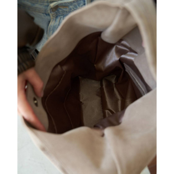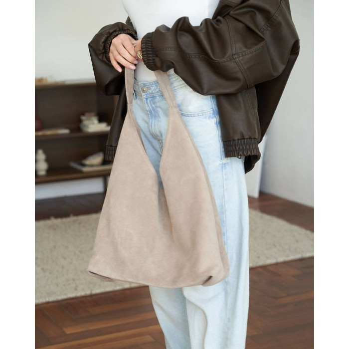 Жіноча сумка K72759, колір бежевий, матеріал сумки натуральна шкіра, замша.Усередині сумка має одну відкриту кишеню та кишеню на блискавці. Сумка має ручку 25 см (від верху сумки).