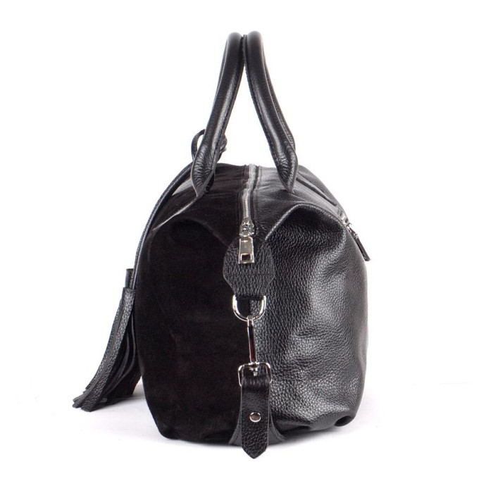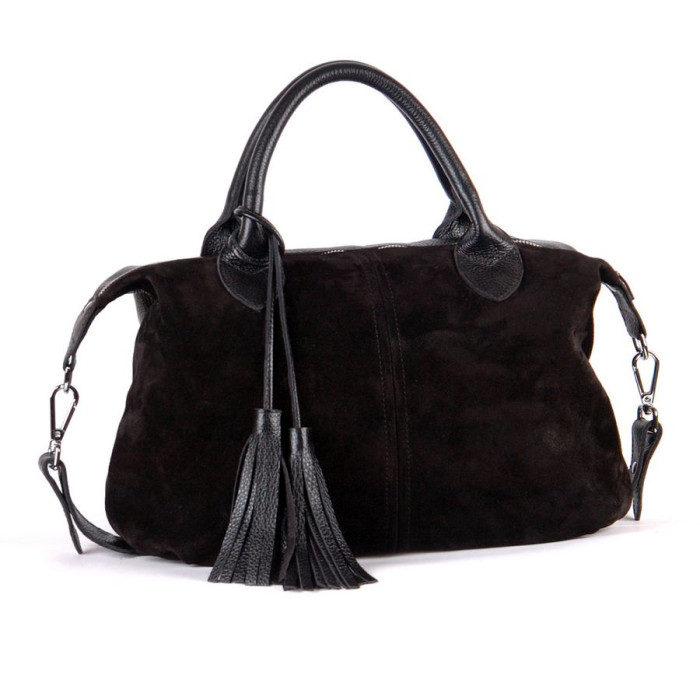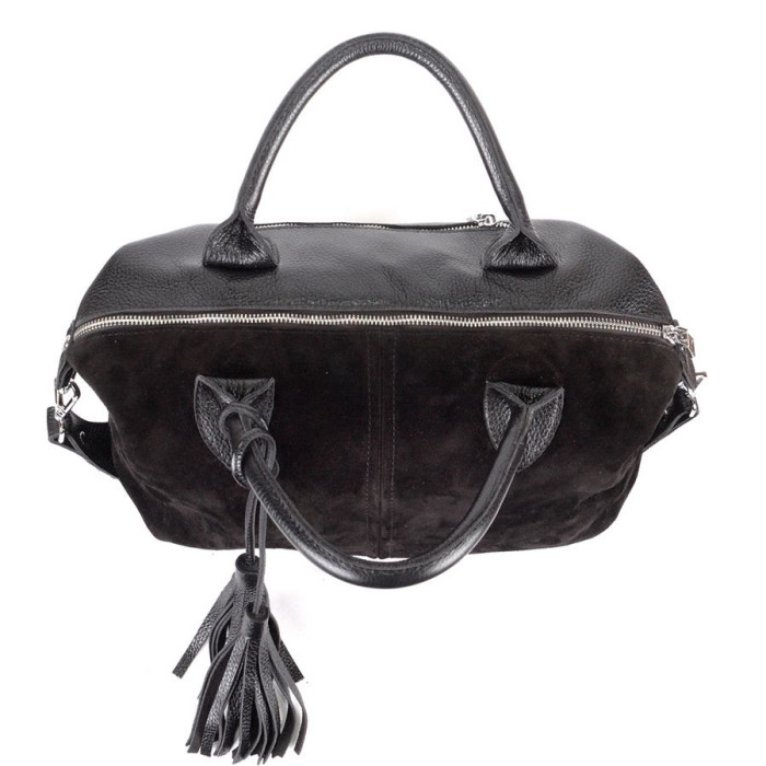 Сумка шкіряна жіноча 200601 замш чорна красивою і зручної форми, прикрашена пензликами