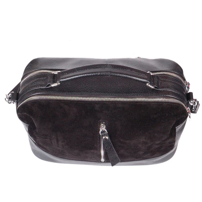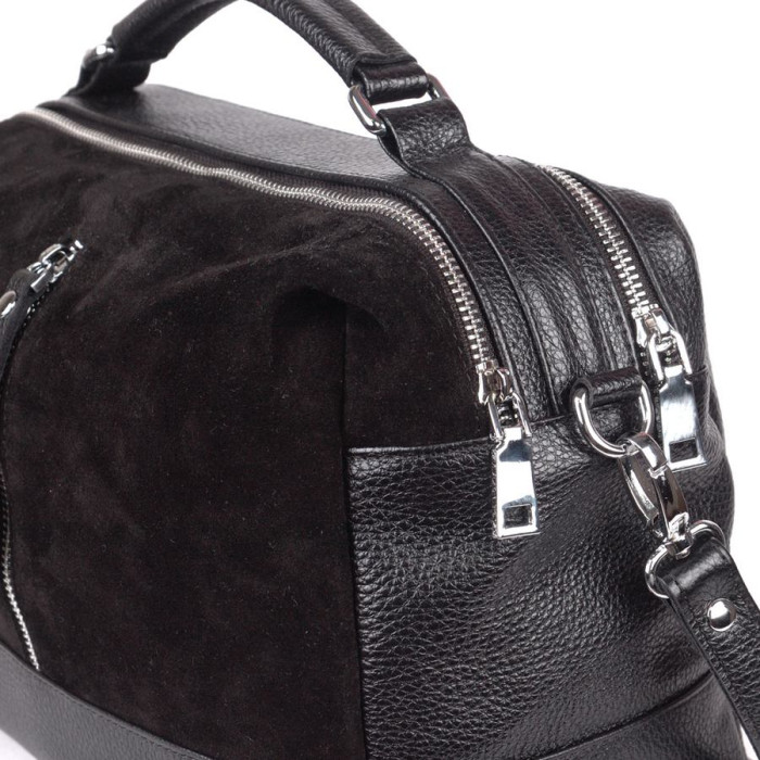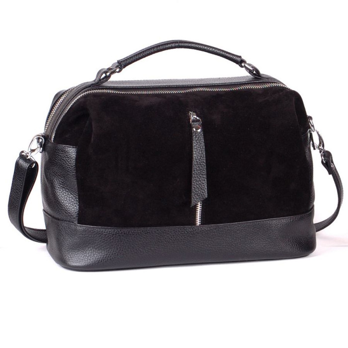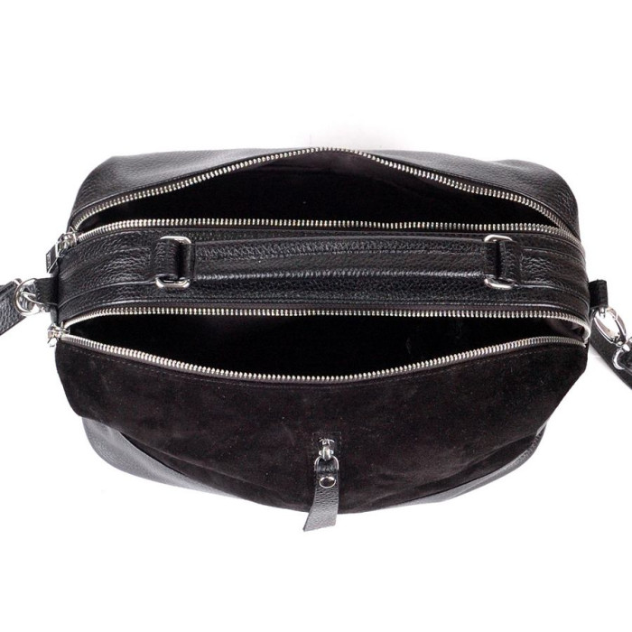 Сумка шкіряна жіноча 440601 з замшевою вставкою чорна середнього розміру на два відділення