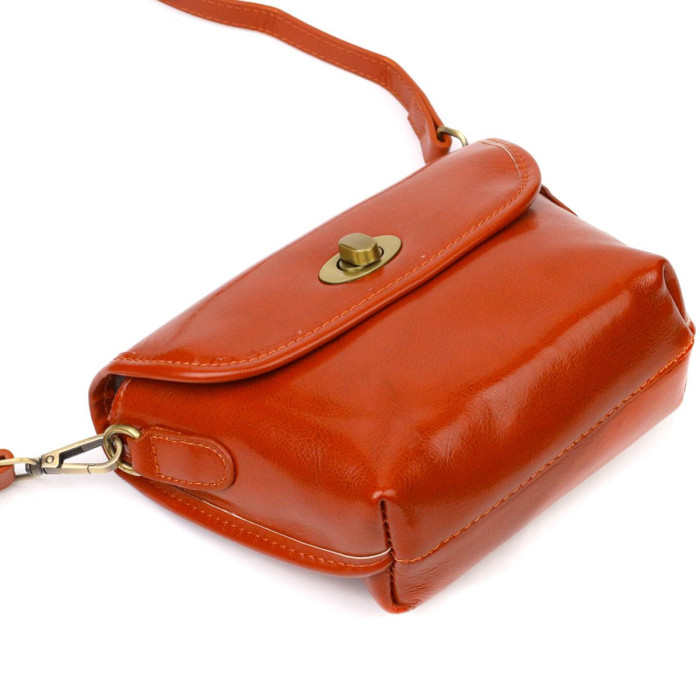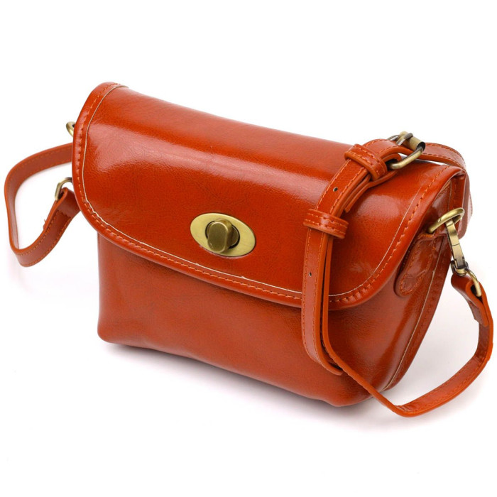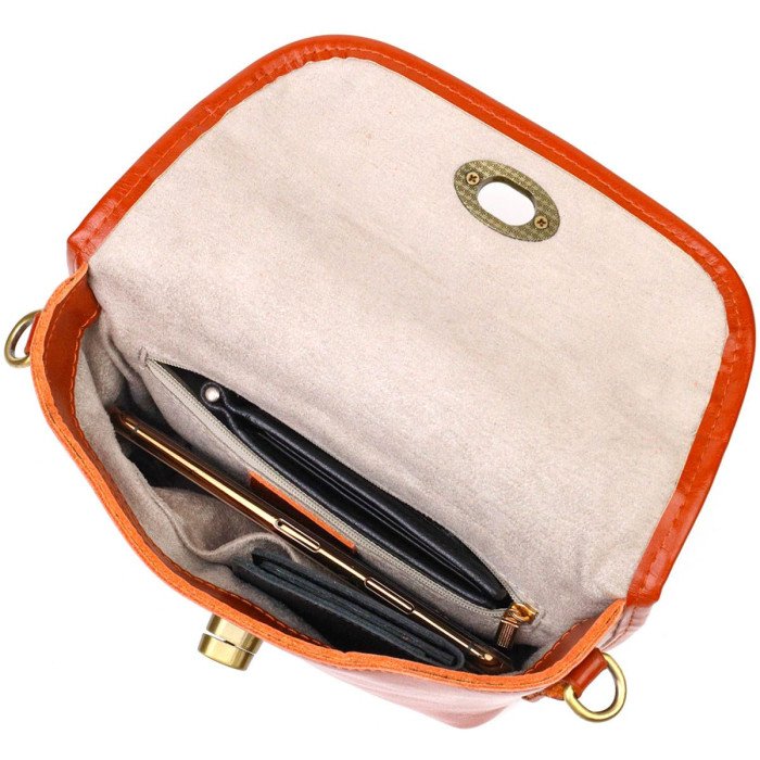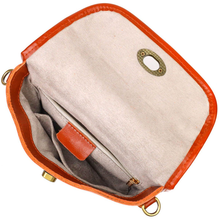 Цікава жіноча сумочка із натуральної м'якої шкіри високої якості. Виріб дуже зручний, можна носити на плечі та через плече, відмінний повсякденний варіант невеликої сумки. Модель доповнена фурнітурою мідного кольору. Аксесуар має одне основне відділення у якому дві кишеньки - на блискавці та відкритого типу, а також кишеню відкритого типу зовні. Модель закривається клапаном на механічну застібку. Стильна та зручна сумка яка розмістить усі дрібниці та навіть більше.