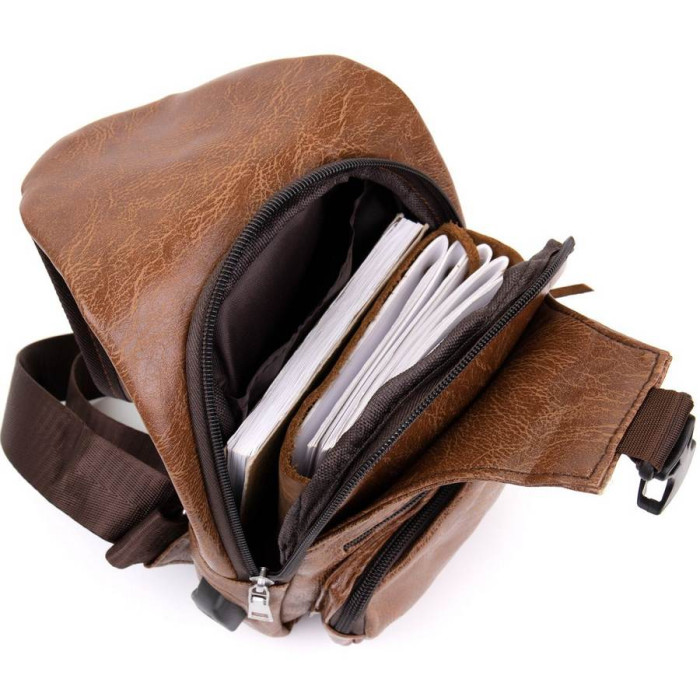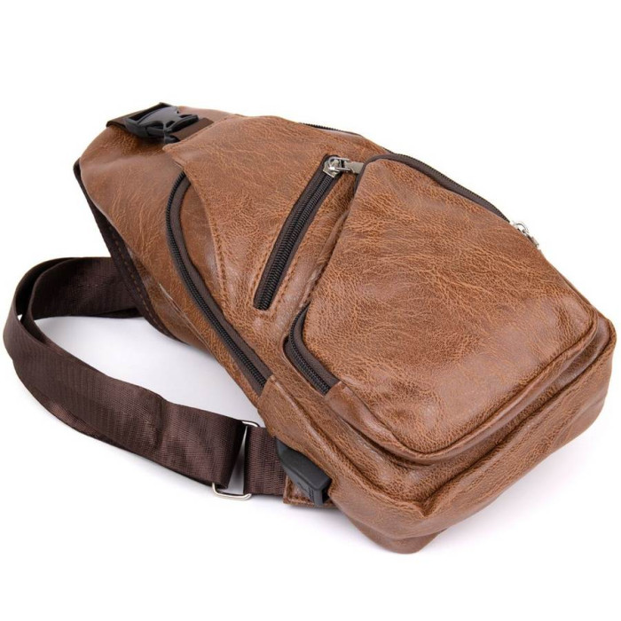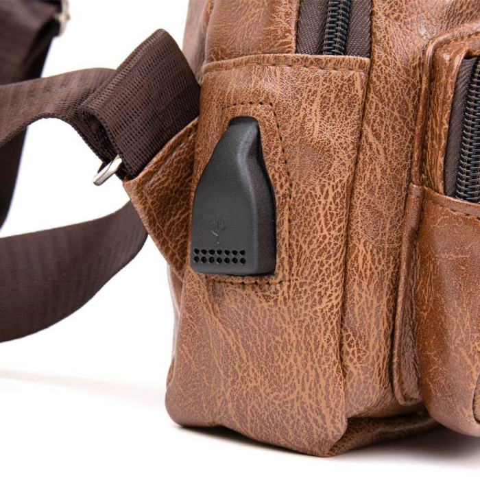 Компактна сумка через плече зі шкірозамінника. Сумка крос боді дуже популярна серед клієнтів. Особливістю даної моделі є те, що всі ваші особисті речі у вас під рукою - а руки вільні. Усередині сумки щільна підкладка коричневого кольору. У аксесуарі міцна фурнітура. Сумка має стильний дизайн під сучасного чоловіка. У комплекті до сумки йде шнур для зарядки. У даній моделі збоку є роз'єми.