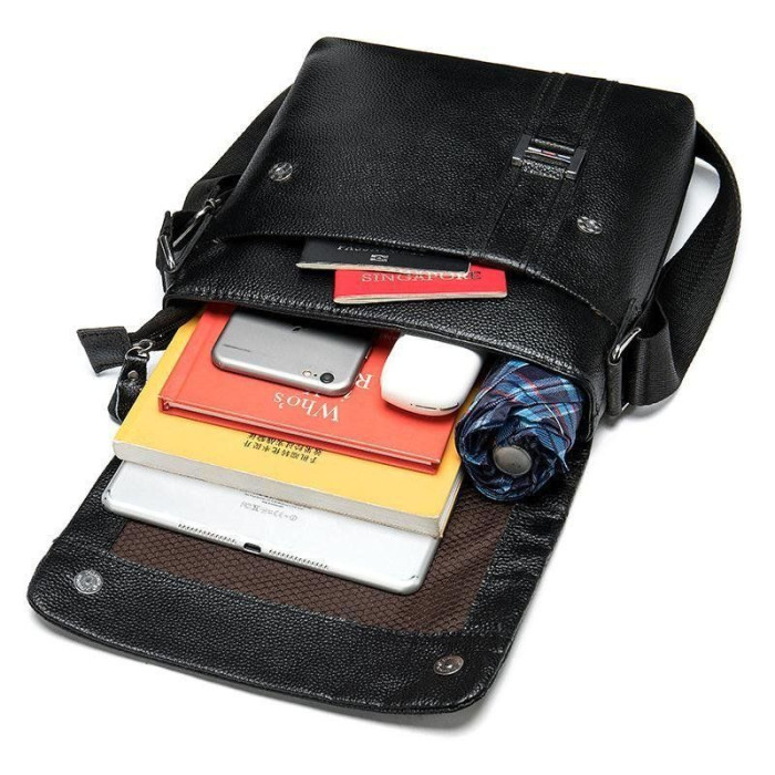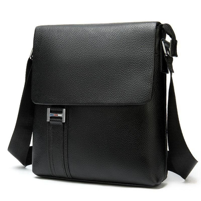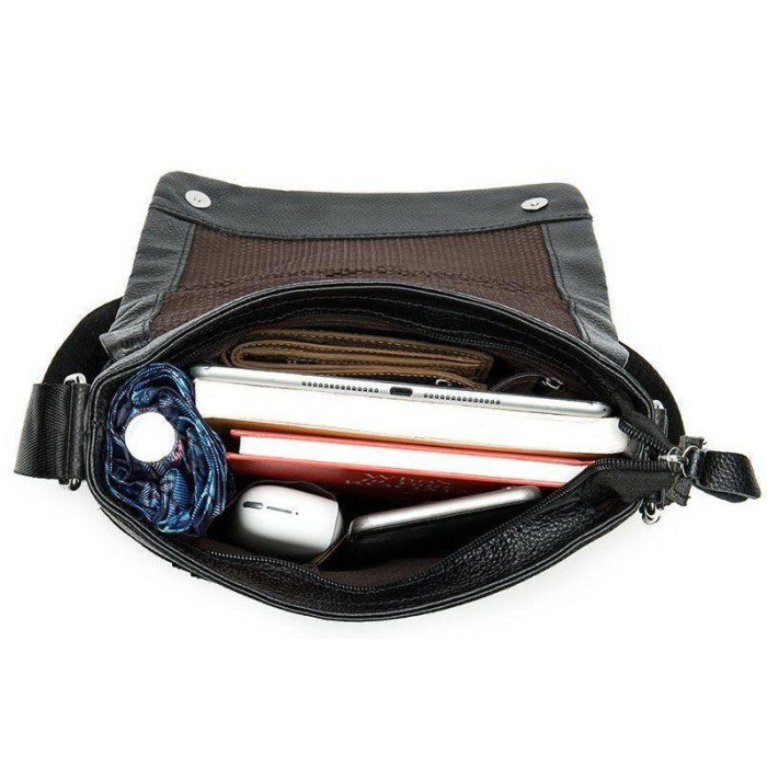 Зручний чоловічий месенджер з натуральної шкіри класичного чорного кольору. Модель виготовлена в шкірі флотар, яка відрізняється своєю стійкістю до подряпин і потертостей. На лицьовій стороні металевий логотип сріблястого кольору. Всередині - коричнева текстильна підкладка. Доповнено виріб фурнітурою сріблястого кольору з міцного металу. У сумці дуже зручно буде носити планшет і інші необхідні речі на кожен день. З нею буде також дуже зручно ходити на роботу або зустрічі. Якщо ви шукаєте невелику і якісну сумку на кожен день рекомендуємо придивитися до даної моделі. Впевнені, що переносите ви її досить довго.