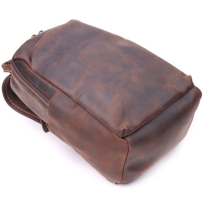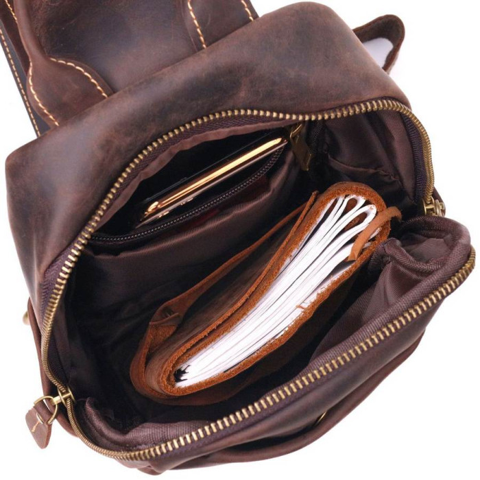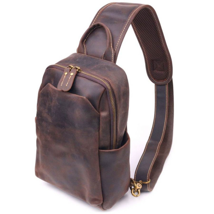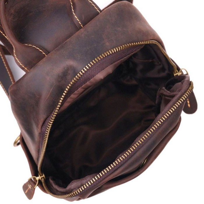 Чудова чоловіча сумка слінг через плече з натуральної вінтажної шкіри з відмінними характеристиками якості та зносостійкості. Аксесуар має містке основне відділення та додаткові кишені для речей, які мають бути швидко доступними. Ремінь можна регулювати по довжині, виконаний він зі шкіри та високоміцного текстилю. Колір фурнітури жовтий. Шкіряна сумка, завжди була чудовим подарунком для рідних та близьких людей.