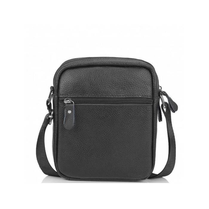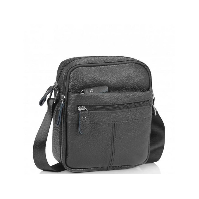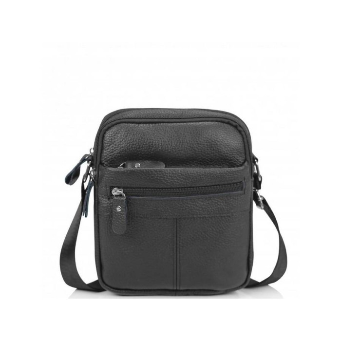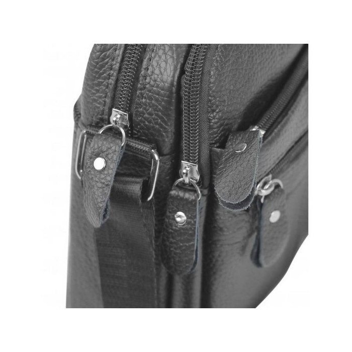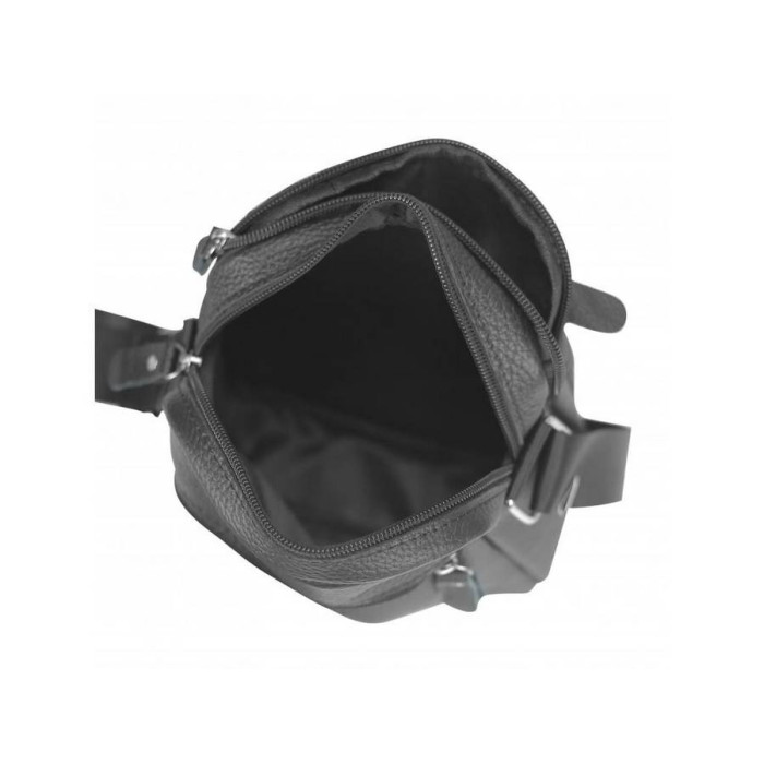 Невелика шкіряна сумка в чорному кольорі. Для носки використовується текстильний ремінь, який регулюється по довжині. Усередині сумки чорна міцна підкладка. Чоловічий месенджер має два основних відділення на блискавці. З лицьового боку дві кишені на блискавці горизонтального типу, з тильного боку також є кишеня на блискавці.