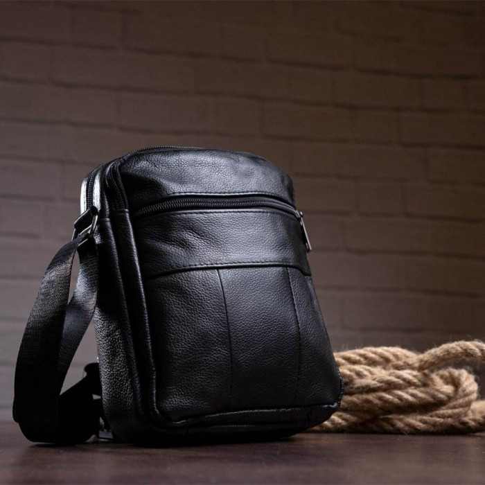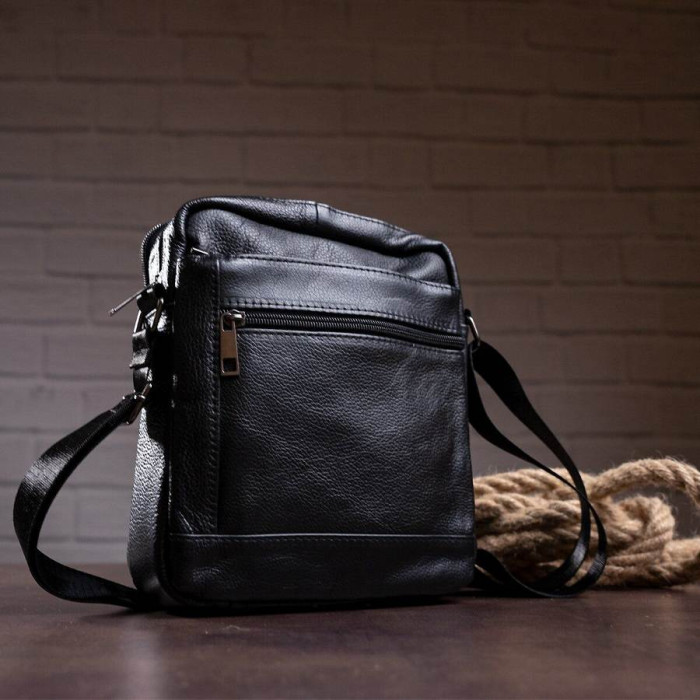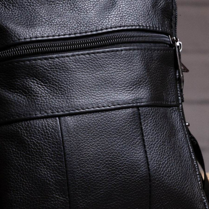 Сумка доповнена фурнітурою сріблястого кольору і прошита по краях чорною ниткою. Усередині коричнева текстильна підкладка. Аксесуар зручно носити на плечі за допомогою ременя. Хороший варіант на кожен день. Сумка не займає багато місця. У догляді модель не примхлива і довго носиться. Особливістю такої моделі є, те що на ній практично не видно подряпин. Буде ідеальним варіантом для подарунка близькій людині. Аксесуар упакований в тканинний мішок.