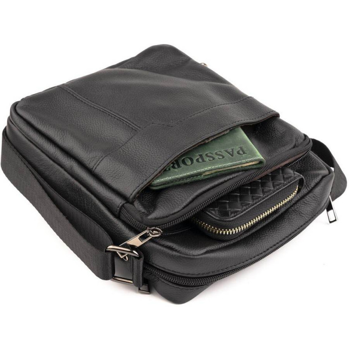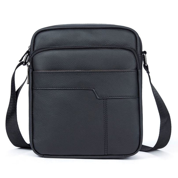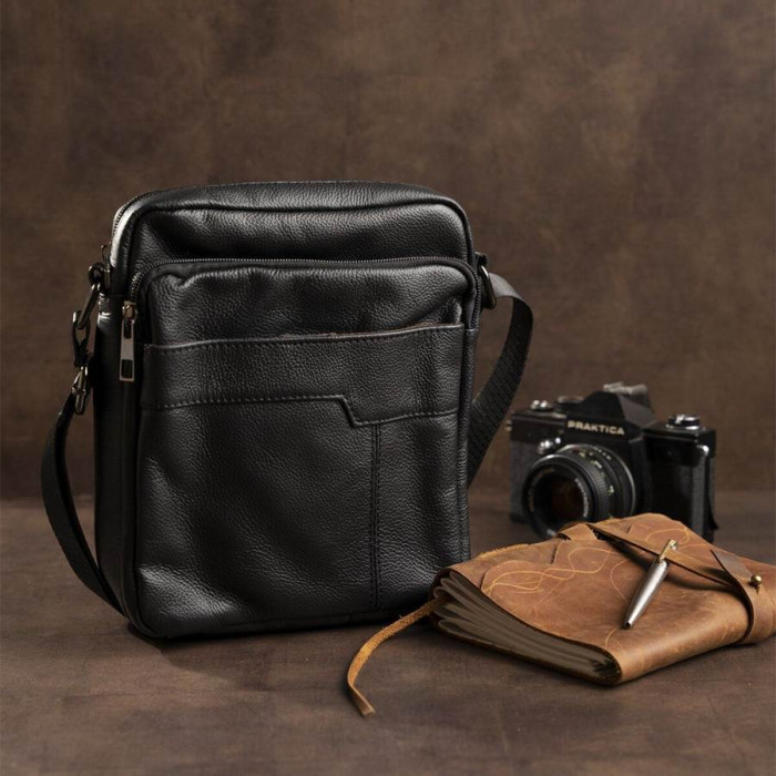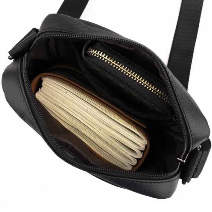 Компактна чоловіча сумка в класичному стилі з натуральної шкіри. Аксесуар прошитий чорною ниткою. Фурнітура сріблястого кольору. Зручна сумка на кожен день. Мінімальний функціонал і оптимальний розмір додають сумці популярності. Чи не вибаглива у використанні і комфортна в носінні. Усередині аксесуара текстильна підкладка коричневого кольору. Аксесуар упакований в тканинний чохол, що захищає його від забруднень і зносу. Буде чудовим подарунком для близької людини.