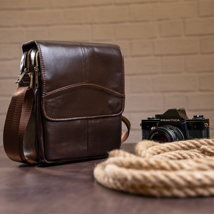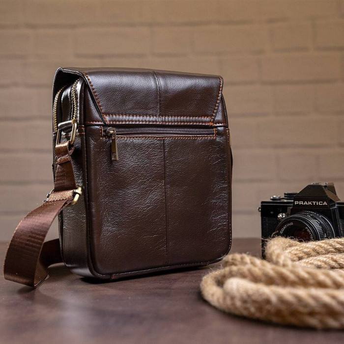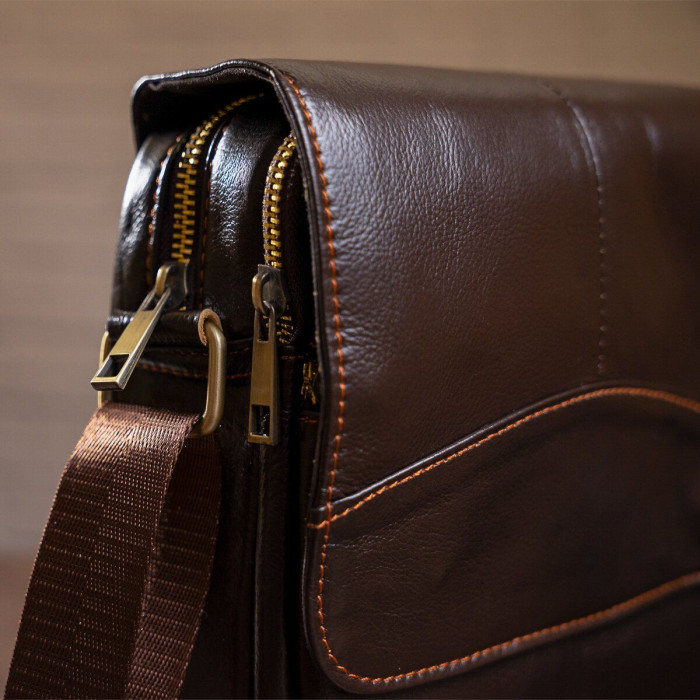 Добротна сумка з натуральної шкіри. Переливається на сонці і не вибаглива в догляді Аксесуар доповнено міцною золотистою фурнітурою і має текстильну ручку на плече. Модель прошита світлою ниткою по краях. Якщо ви вибираєте аксесуар на подарунок, варто придивитися до такої сумки. Винуватець торжества однозначно залишиться задоволений.
