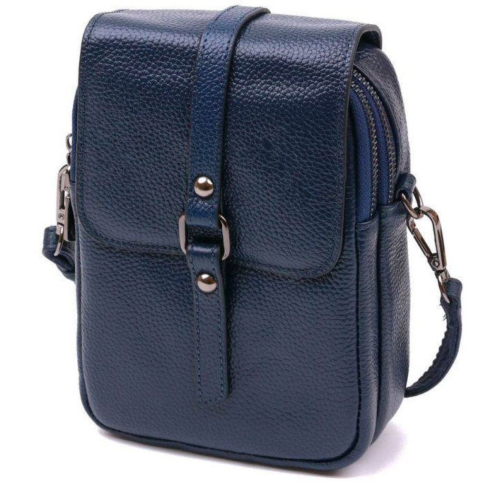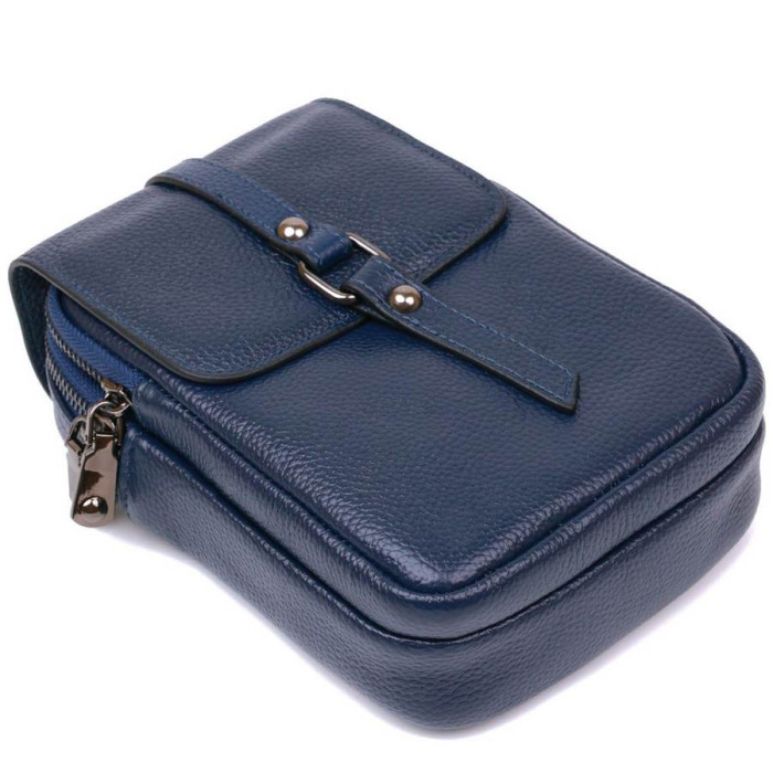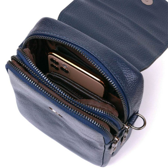 Незвичайна синя сумка з якісної зернистої натуральної шкіри, м'якої та приємної на дотик. Виріб має достатньо відділень. Якість виробу дуже висока. Нитки, що стирчать відсутні, міцна фурнітура і щільна підкладка. Ця модель стане чудовим подарунком для будь-якого чоловіка. У комплекті йде пилозахисний чохол.