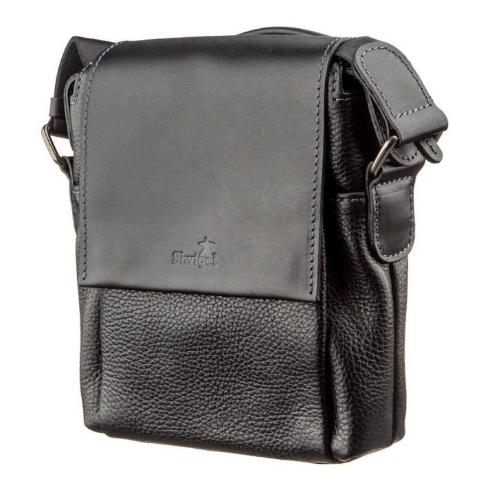 Оригінальна сумка для самих впевнених в собі чоловіків. Модель виконана в комбінації шкіри флотар і матової. На таку сумку буде складно не звернути увагу. По краях аксесуар прошитий світлою синьою ниткою. Весь функціонал до дрібниць продуманий для сучасних чоловіків, які цінують якість і комфорт. Сумка доповнена ручкою, як на плече, так і в руку, що робить її ще більш зручною. Усередині синій якісний подклад з міцного текстилю.