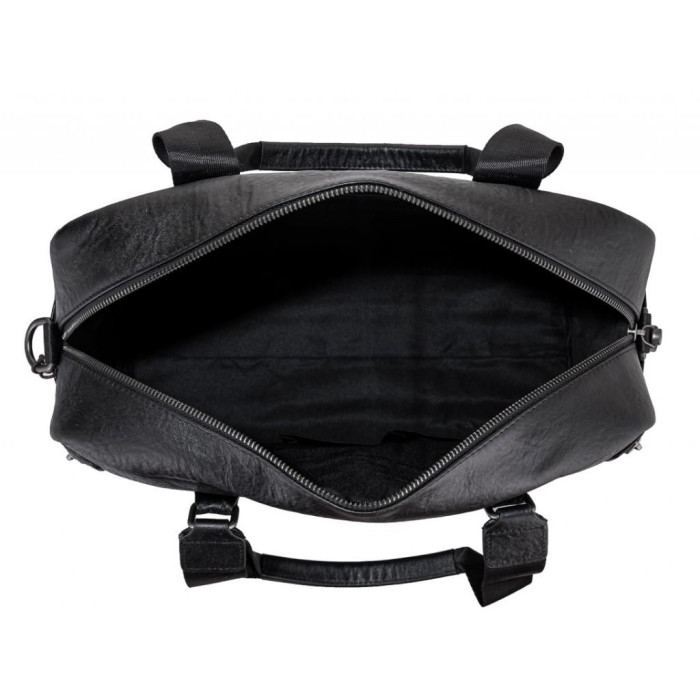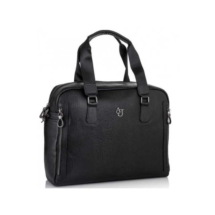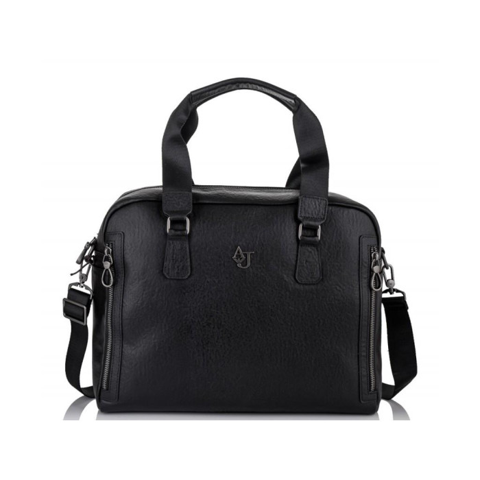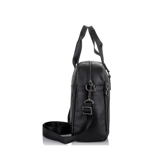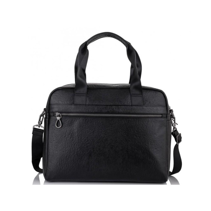 Стильна чоловіча ділова сумка з натуральної шкіри з фактурною поверхнею. Зверху виробу анатомічні ручки, ущільнені шкірою для носіння сумки в руці, також в комплекті ремінь через плече з щільного текстилю, кріпиться на бокові петлі за допомогою карабінів і відстібається при необхідності. З тильного боку сумки відсік горизонтального формату на блискавці. Надійна фурнітура темного відтінку.