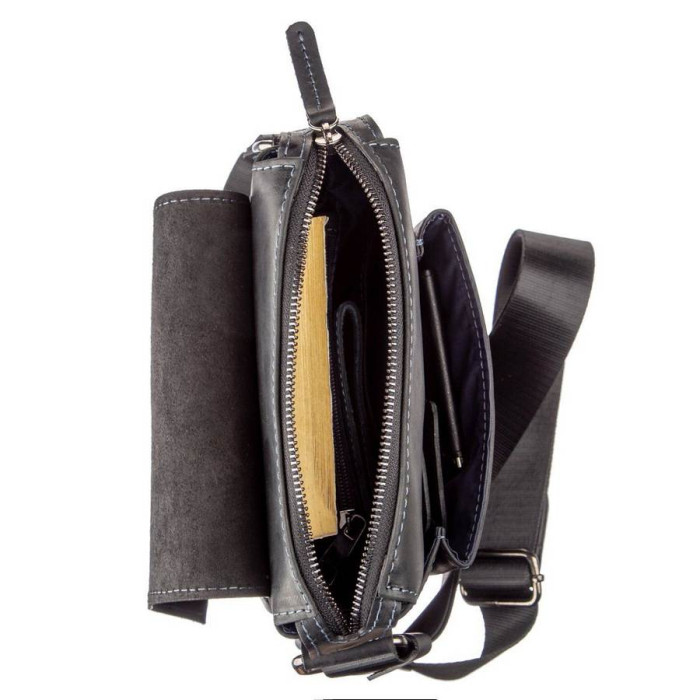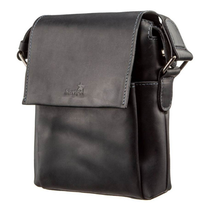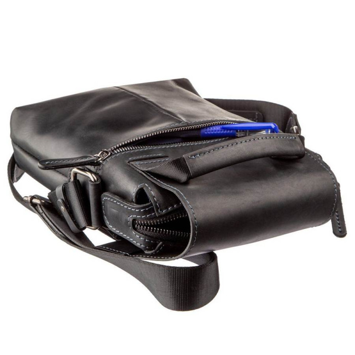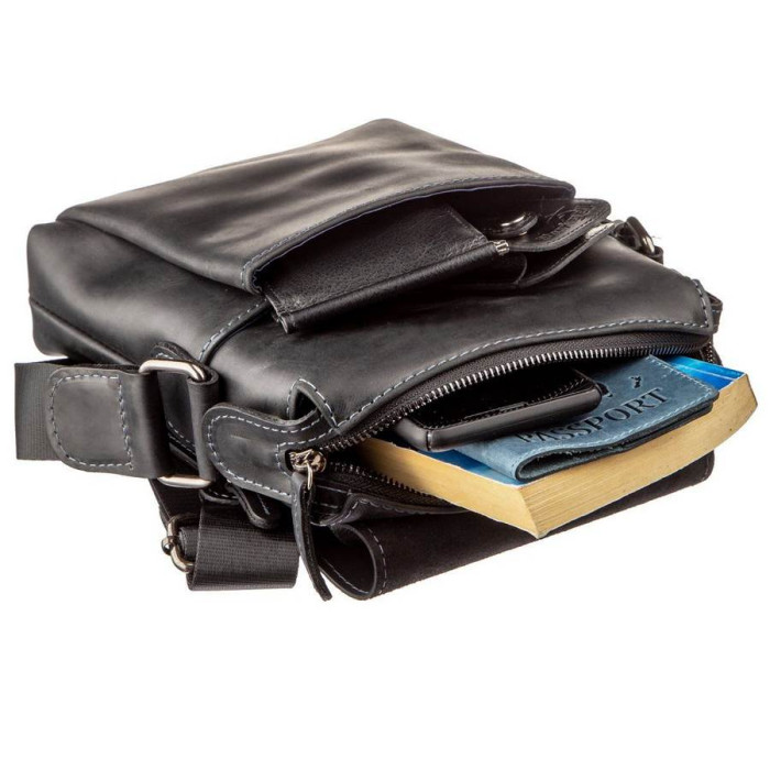 Чоловіча шкіряна сумка невеликого розміру з клапаном на закритих магнітах. Аксесуар виконаний з натуральної вінтажної шкіри, характерними ознаками якої є: неоднорідність забарвлення і потертості, які надають особливий зовнішній вигляд. Модель розроблена спеціально для найстильніших чоловіків. Всередині: різноманітні кишені для вашої зручності і синя текстильна підкладка. Аксесуар прошитий по краях світло-синьою ниткою, що додає моделі особливого шику. Сумка упакована в тканинний чохол.