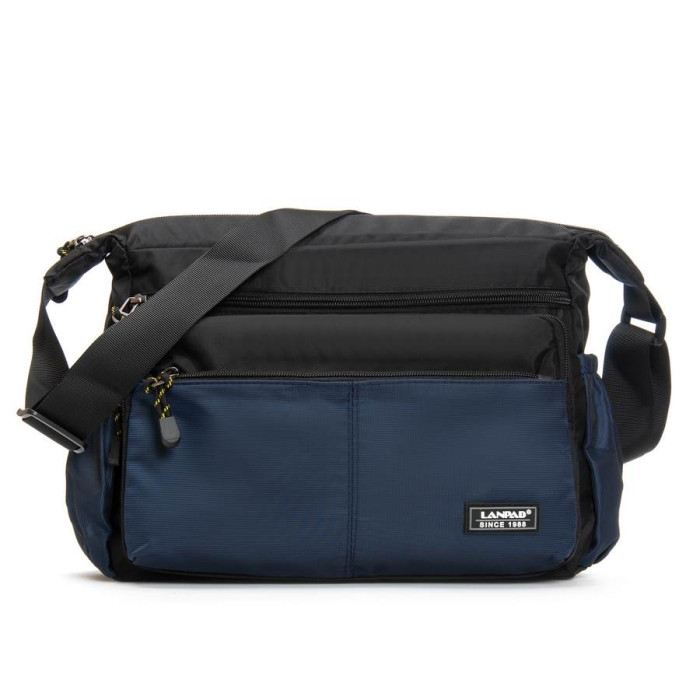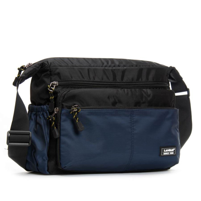 Сумка чоловіча Lanpad. Закривається на блискавку. Усередині знаходиться подвійне відділення, розділене кишенею-перегородкою на блискавці, кишеню на блискавці та відкриту подвійну кишеню. На фасаді та зворотному боці знаходяться місткі кишені на блискавці. На торцях сумки також розташовані відкриті кишені. Регульований плечовий ремінь шириною 4см.