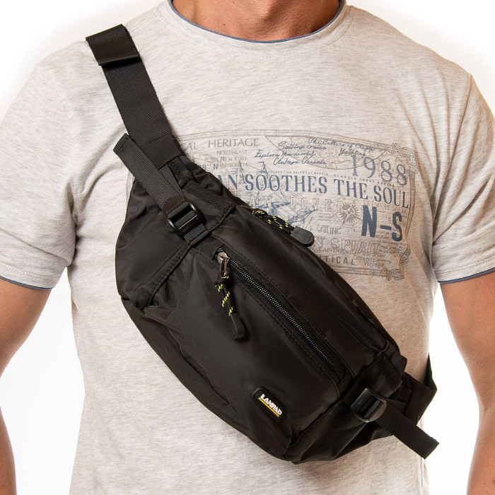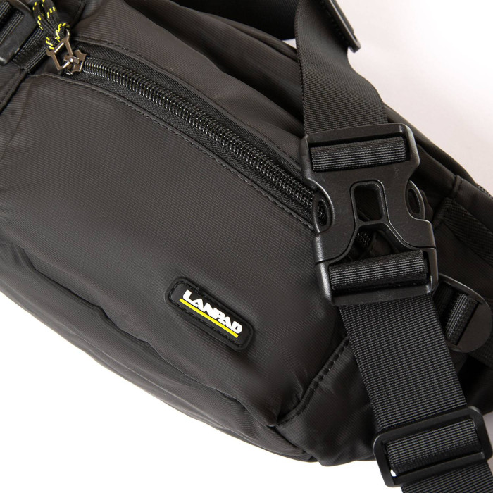Чоловіча сумка пояс/плечо Lanpad. Два відділення, що закриваються на блискавку. Усередині основного відділення є бічна кишеня на блискавці. На фасаді розташована одна містка кишеня на блискавці і дві невеликі відкриті кишені по краях. Регульований ремінь шириною 4см.