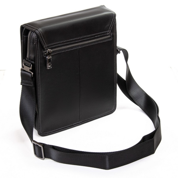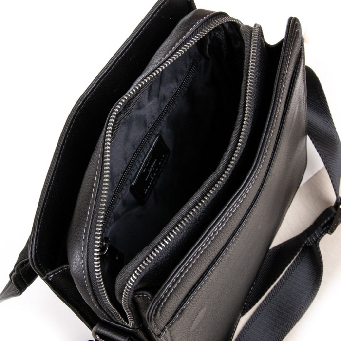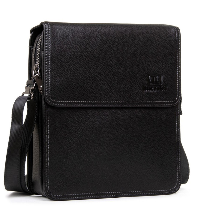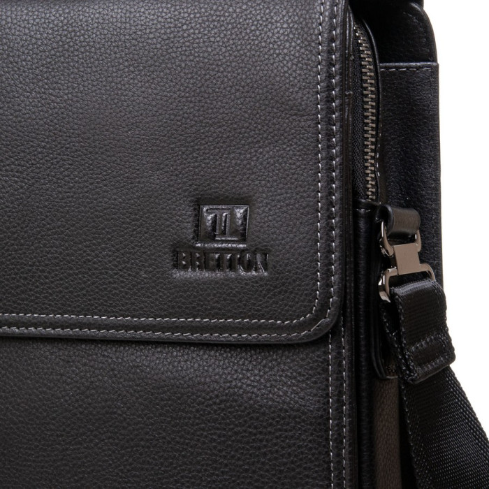 Чоловіча шкіряна сумка-планшет Bretton. Під клапаном знаходяться три відділення, центральне додатково закривається на блискавку. Усередині основного відділення є бічна відкрита кишеня та кишеня на блискавці. На фасаді сумки є плоска відкрита кишеня, а на звороті розташована кишеня на блискавці. Регульований плечовий ремінь.