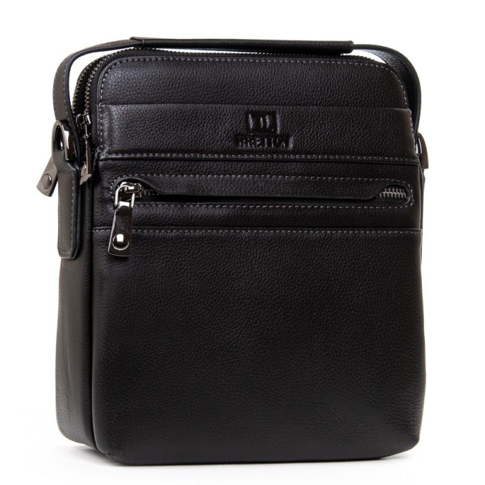 Чоловіча шкіряна сумка-планшет Bretton. Два відділення, що закриваються на блискавку. Усередині одного відділення є бічна відкрита кишеня, а всередині іншого - кишеня на блискавці. На фасаді сумки є дві великі кишені: одна закривається на магнітну кнопку, а друга на блискавку. На звороті розташована кишеня на блискавці. Регульований плечовий ремінь у комплекті.