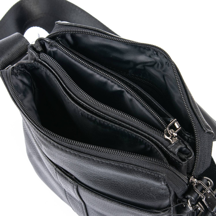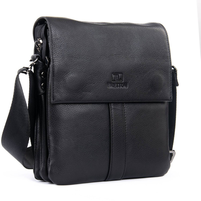 Чоловіча шкіряна сумка-планшет Bretton. Під клапаном додатково закривається на блискавку. Усередині є два відділення, плоский кишеня-перегородка, відкрита кишеня і бічна кишеня на блискавці. На фасаді сумки під клапаном є кишеня на магнітній кнопці, а на зворотному боці кишеня на блискавці. Регульований плечовий ремінь.