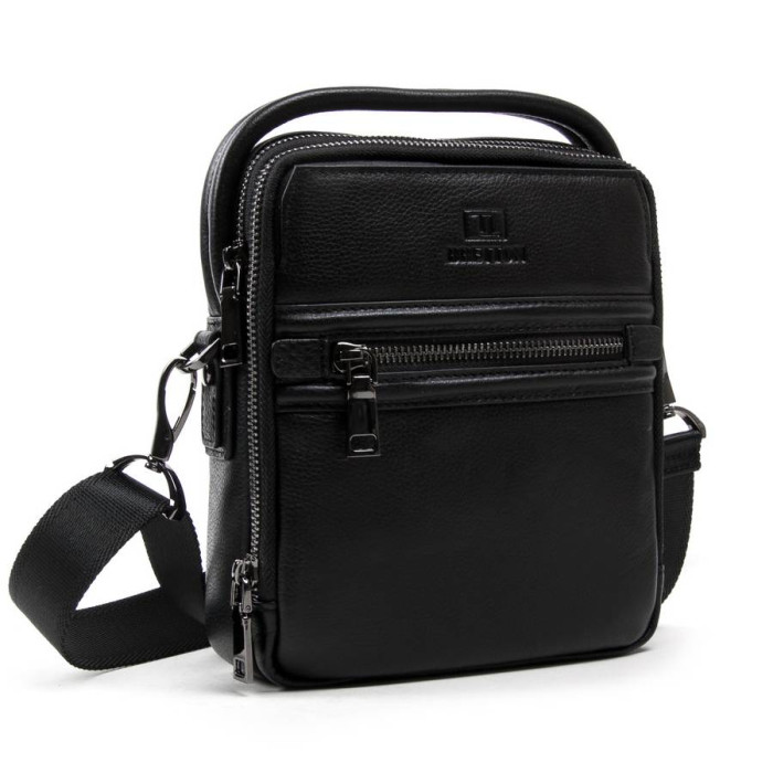 Чоловіча шкіряна сумка-планшет Bretton. Виготовлена з м'якої натуральної шкіри. Два відділення, закриваються на блискавку. Усередині першого відділення є відкрита кишеня, а в другому відділенні знаходиться бічна кишеня на блискавці. На фасаді сумки є кишені на блискавці і на магнітній кнопці, а на зворотному боці одна кишеня на блискавці. Регульований плечовий ремінь в комплекті.