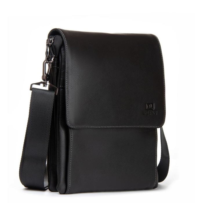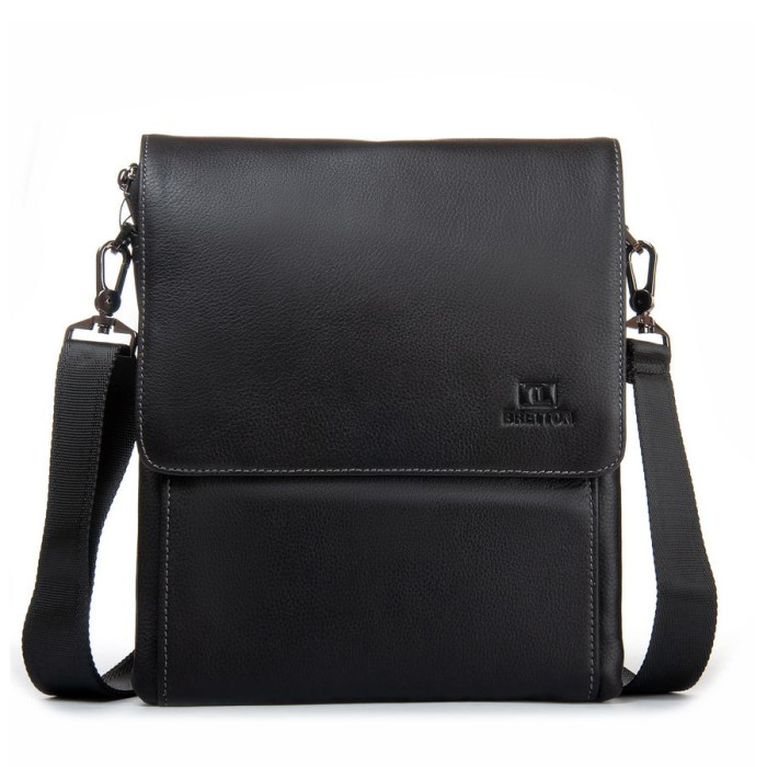 Чоловіча шкіряна сумка-планшет Bretton. Під клапаном додатково закривається на блискавку. Усередині знаходиться подвійне відділення, розділене кишенею-перегородкою, відкрита кишеня і бічна кишеня на блискавці. На фасаді сумки під клапаном є дві відкриті кишені і одна кишеня на блискавці. На зворотному боці розташована кишеня на блискавці. Регульований плечовий ремінь в комплекті.