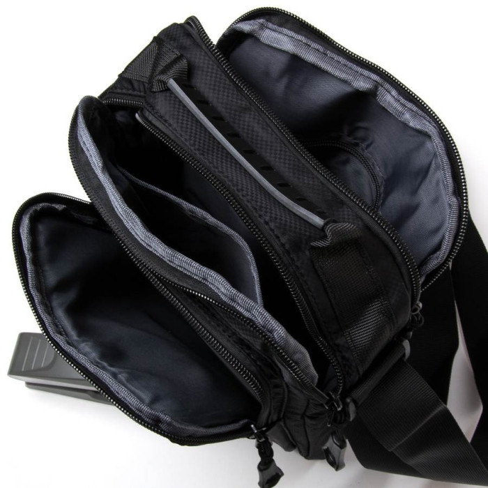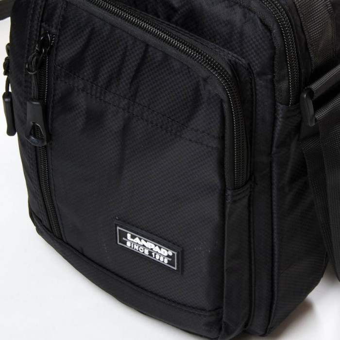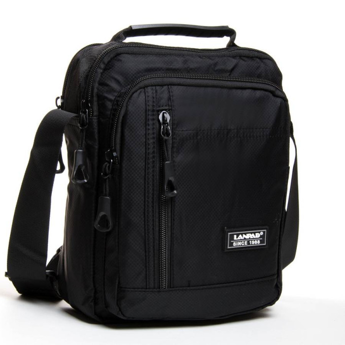 Чоловіча сумка Lanpad. Два відділення, що закриваються на блискавку. Усередині відділення розташована кишеня на блискавці та відкрита кишеня. На фасаді знаходяться 2 кишені на блискавці і на звороті є одна кишеня на блискавці. Регульований плечовий ремінь шириною 4см.