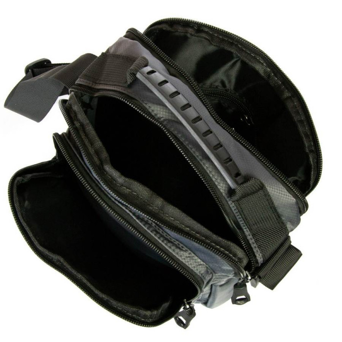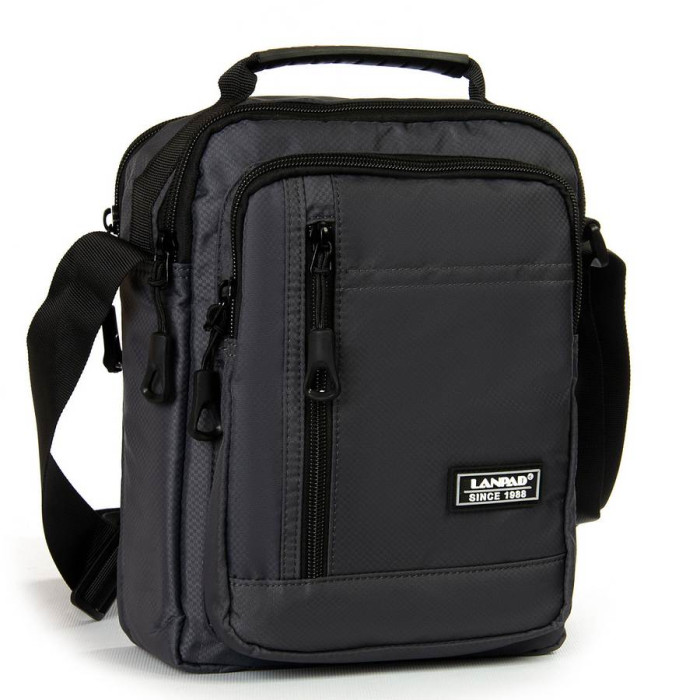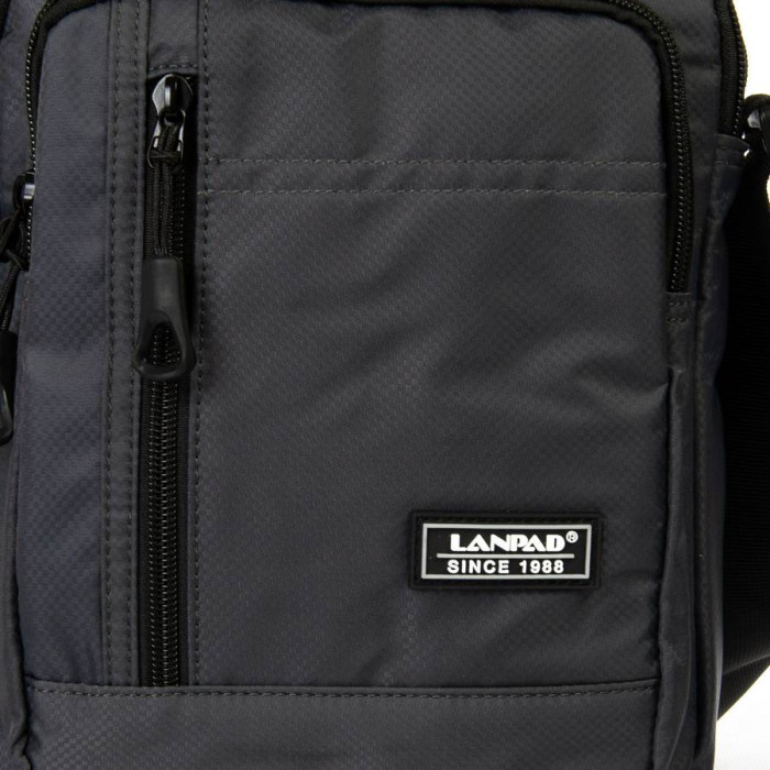 Чоловіча сумка Lanpad. Два відділення, що закриваються на блискавку. Усередині відділення розташована кишеня на блискавці та відкрита кишеня. На фасаді знаходяться 2 кишені на блискавці і на звороті є одна кишеня на блискавці. Регульований плечовий ремінь шириною 4см.