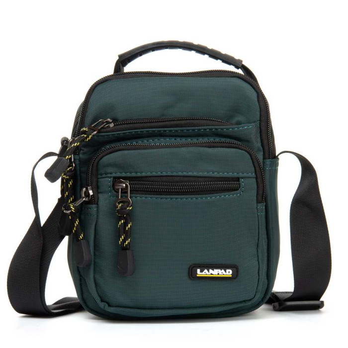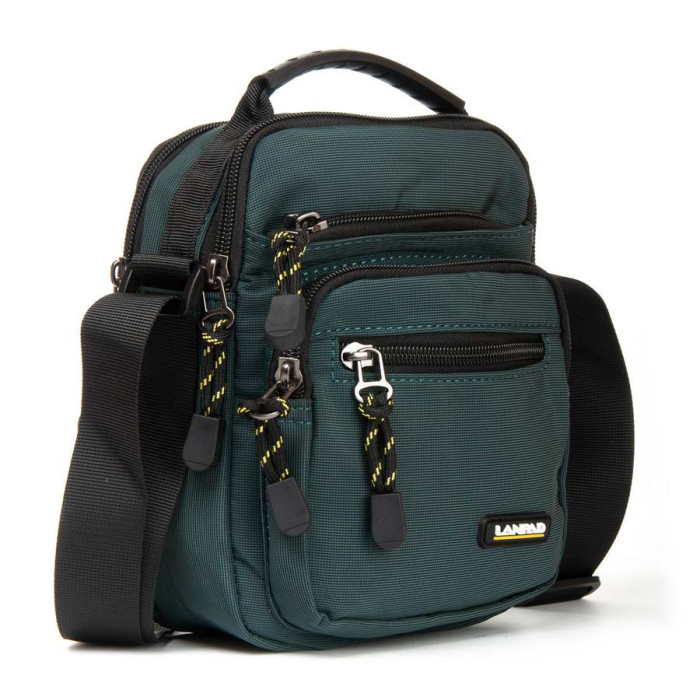 Сумка чоловіча Lanpad. Два відділення, що закриваються на блискавку. Усередині відділень є кишеня на блискавці. На фасаді знаходяться три кишені на блискавці. Регульований плечовий ремінь шириною 3см.