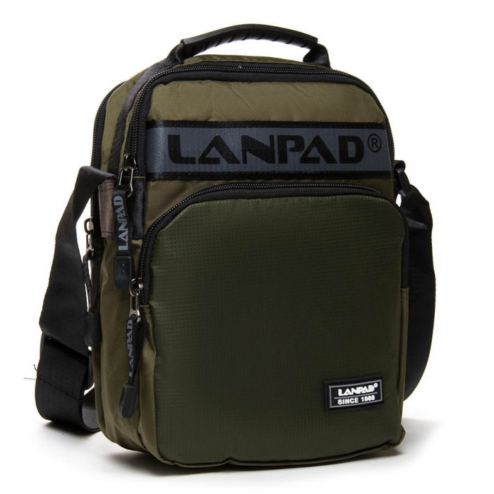 Сумка чоловіча Lanpad. Два відділення, що закриваються на блискавку. Усередині відділення є кишеня на блискавці та відкрита кишеня. На фасаді знаходиться велика кишеня на блискавці. На звороті є кишеня на блискавці. Регульований плечовий ремінь.