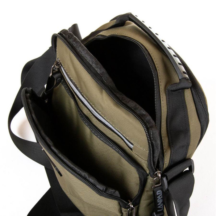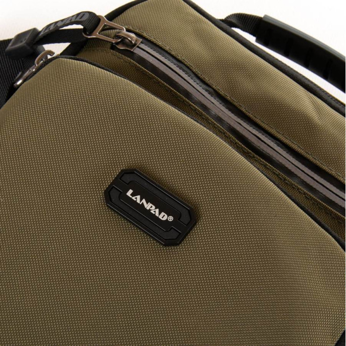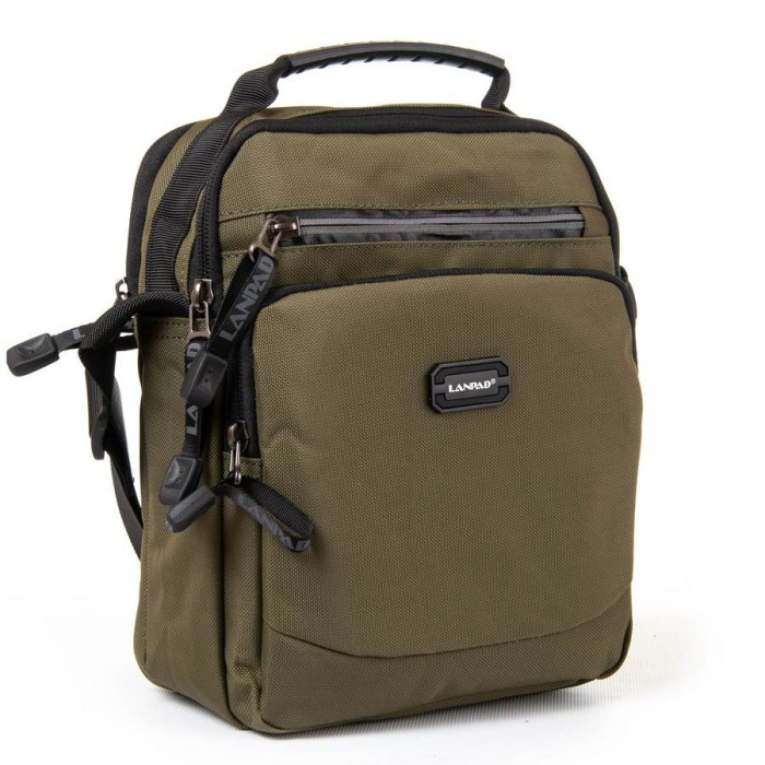 Сумка чоловіча Lanpad. Два відділення, що закриваються на блискавку. Усередині відділень є кишеня на блискавці та відкрита кишеня. На фасаді знаходяться дві великі кишені на блискавці. На звороті є одна кишеня на блискавці. Регульований плечовий ремінь.