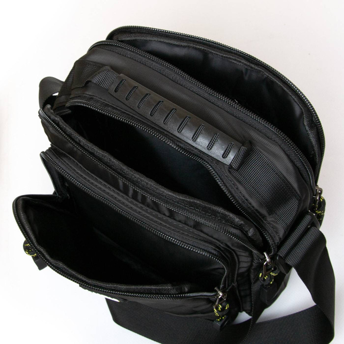 Чоловіча сумка планшет Lanpad. Два відділення, що закриваються на блискавку. Усередині відділень розташована кишеня на блискавці та відкрита кишеня. На фасаді знаходяться дві великі кишені на блискавці. На звороті є одна кишеня на блискавці. Регульований плечовий ремінь шириною 4см.