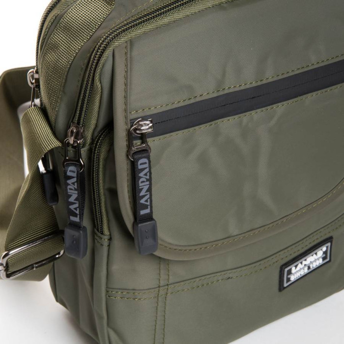 Чоловіча сумка Lanpad. Два відділення, що закриваються на блискавку. Усередині відділення розташована кишеня на блискавці та відкрита кишеня. На фасаді на клапані та під клапаном знаходиться велика кишеня на блискавці. На звороті є кишеня на блискавці. Регульований плечовий ремінь.