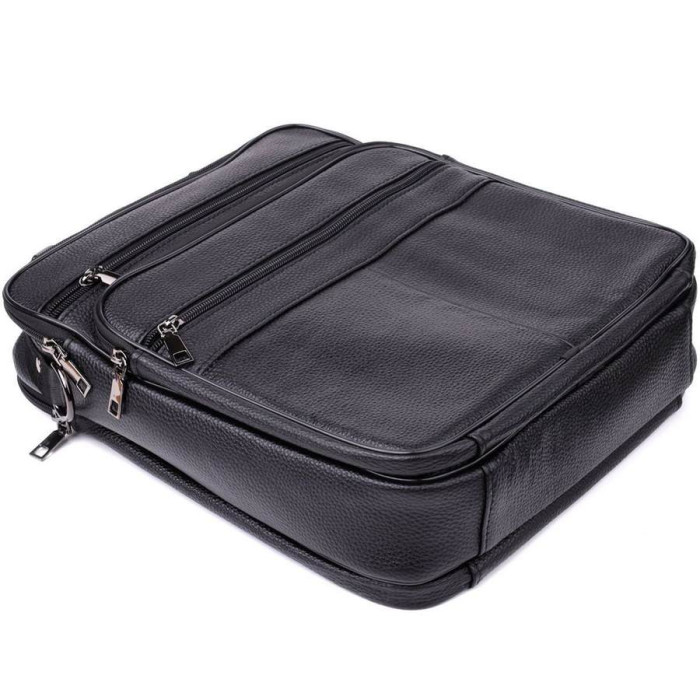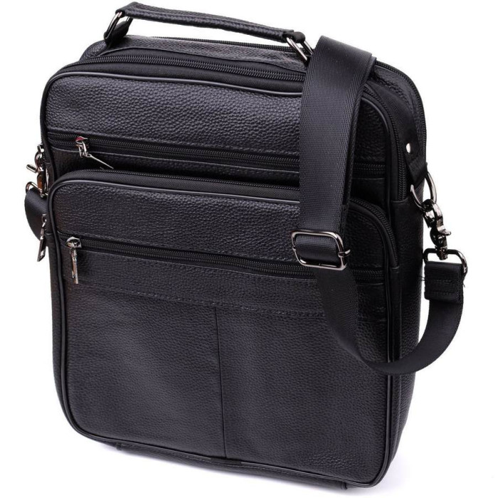 Універсальна чоловіча сумка виконана із міцної натуральної зернистої шкіри флотар, яка відрізняється вираженою текстурою та високою зносостійкістю. Елегантний зовнішній вигляд доповнений фурнітурою срібла, що надає моделі стриманий стиль.