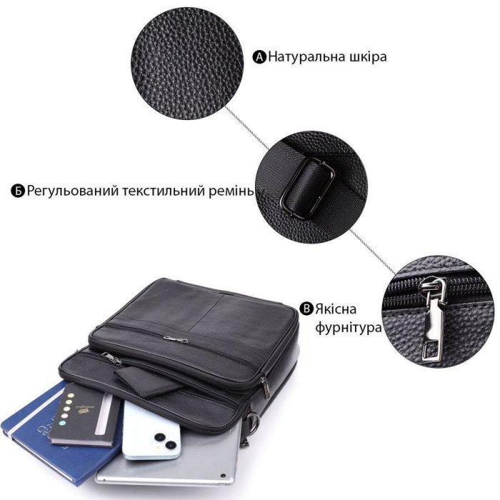 Сумка оснащена шкіряною ручкою для перенесення в руці і регульованим знімним текстильним ремінцем, який можна налаштувати по довжині і носити сумку через плече.