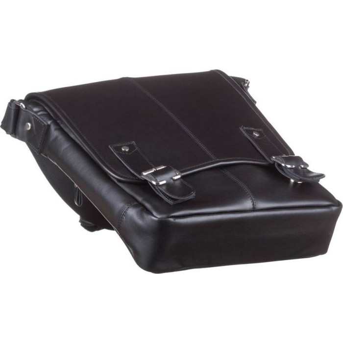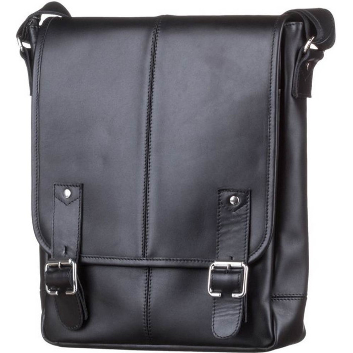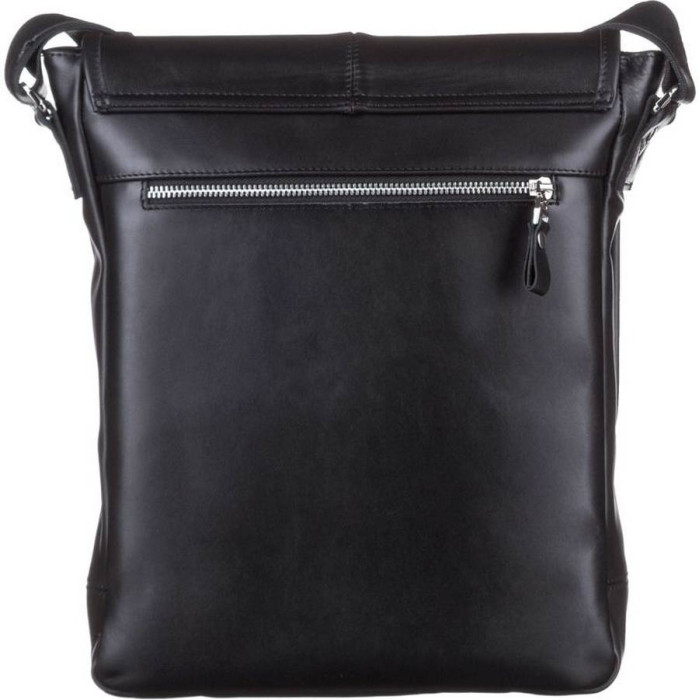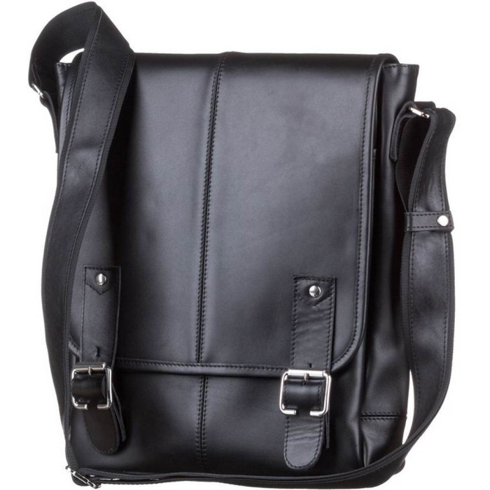 Зручна шкіряна чоловіча сумка високої якості. Виріб виконаний зі шкіри чорного кольору. Шкіра добротна, приємна на дотик. Колір фурнітури: срібло. Сумка акуратно прошита надміцною ниткою чорного кольору. На задній зовнішній стороні аксесуара розташоване відділення на блискавці. Дана модель носитися через плече. Плечовий ремінь виконаний в комбінації натуральної шкіри і міцного текстильного матеріалу. Сумка закривається за допомогою клапана і 2-х шкіряних хлястиків на магнітних кнопках, а також блискавкою. Під клапаном знаходиться містка накладна кишеня. Підкладка виконана з міцного текстильного матеріалу чорного кольору.