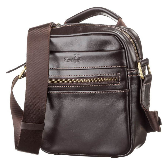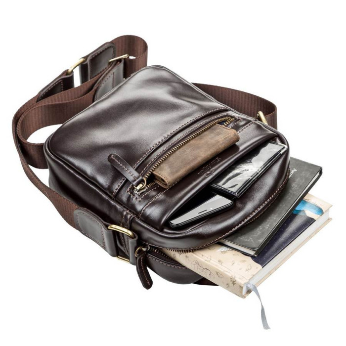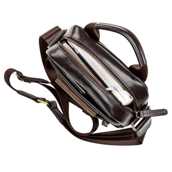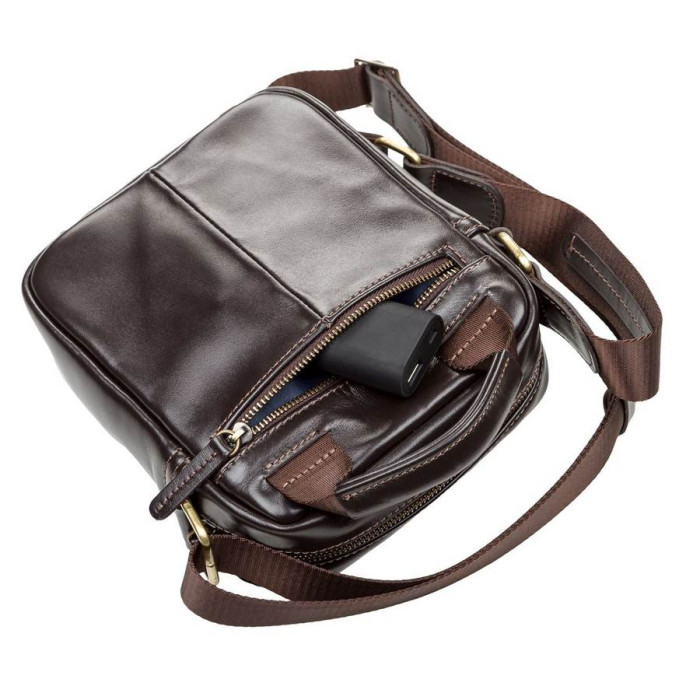 Компактна чоловіча сумка з натуральної високоякісної гладкої шкіри. Аксесуар прошитий світлою ниткою, що надає виробу міцності і оригінального вигляду. Даний аксесуар не тільки функціональний у використанні, але і доповнює елегантний образ сучасного чоловіка. Розмір сумки невеликий, але вмісткий і дуже зручний.