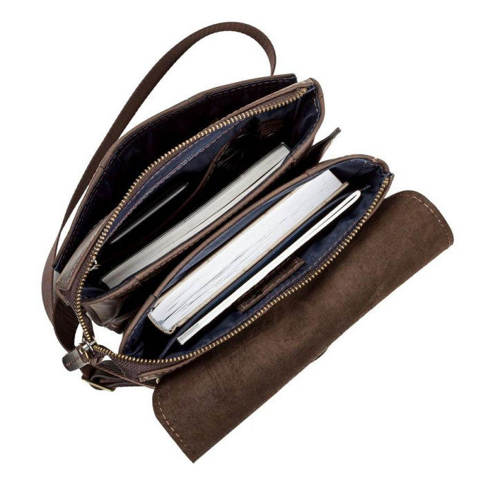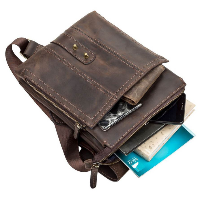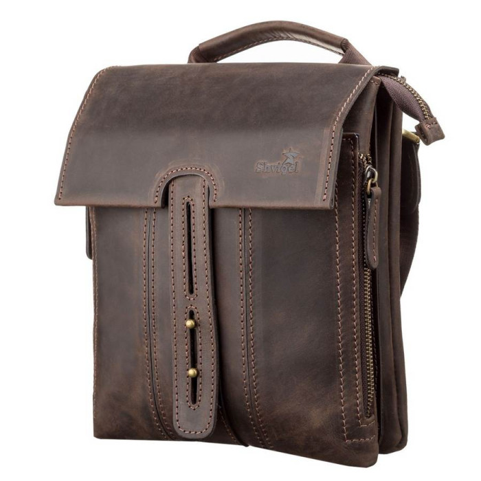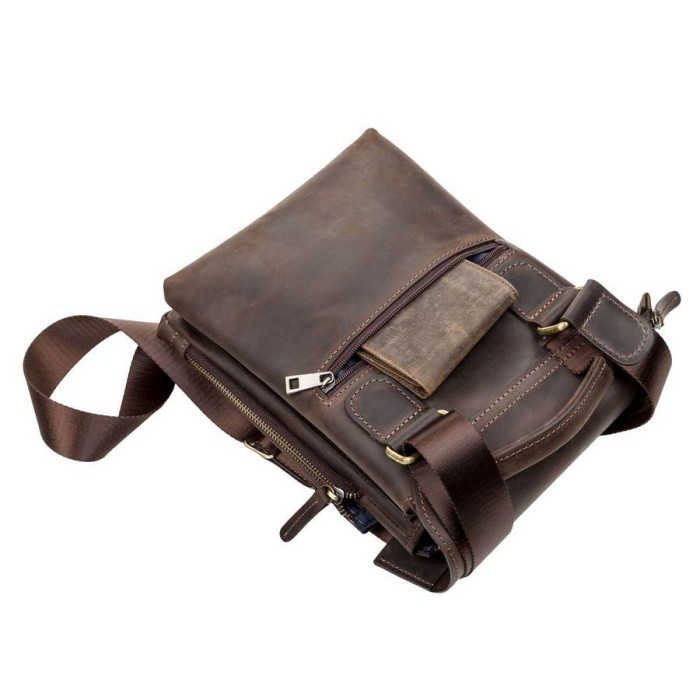 Чоловіча шкіряна сумка-планшет невеликого розміру з клапаном і хлястиком. Виріб виконаний з натуральної вінтажної шкіри, характерними ознаками якої є: неоднорідність забарвлення і потертості, які надають виробу вишуканого, індивідуального виду. Аксесуар прошитий світлою ниткою, що надає виробу міцності і оригінального вигляду. Аксесуар виглядає дуже стильно і дорого.