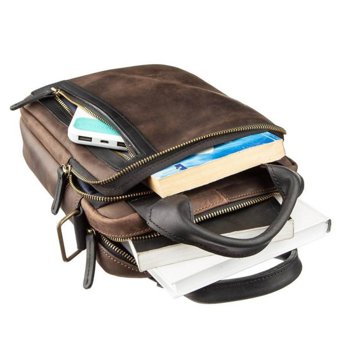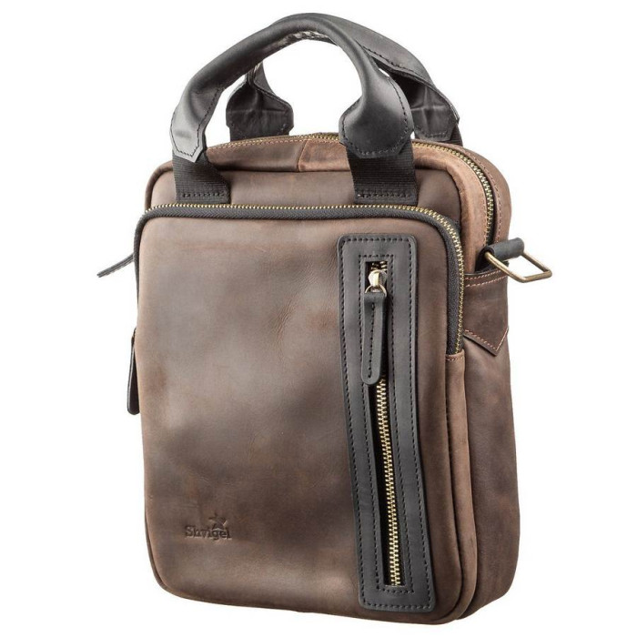Новинка від українського виробника Shvigel в поєднанні двох популярних кольорів. Аксесуар виконаний з натуральної телячої шкіри найвищої якості. Усередині сумки міцна текстильна підкладка синього кольору. Така сумка дуже зручна для роботи або зустрічей. У неї чудово вміститься планшет і все необхідне на кожен день. Є 2 варіанти носіння сумки: в руках за допомогою відповідних шкіряних ручок і на плечі за допомогою зйомного ремня. Аксесуар буде чудовим варіантом для тих, хто водить машину, тому що модель дуже зручно діставати і вона не затирається. Сумка доповнена золотистою фурнітурою. Модель виконана в шкірі Crazy horse.