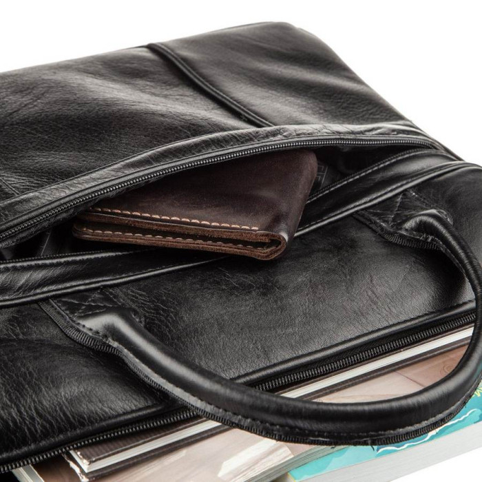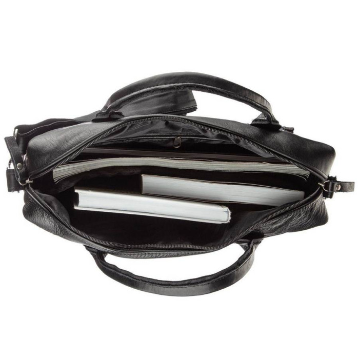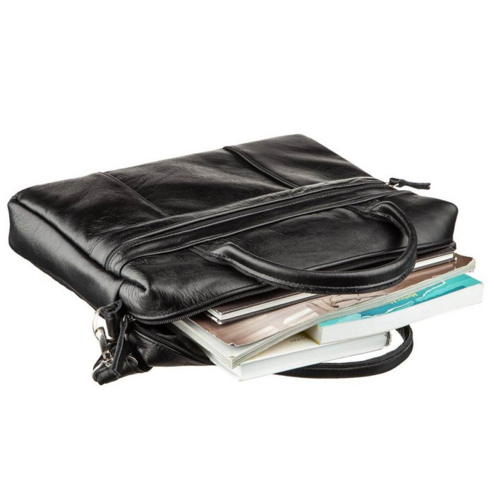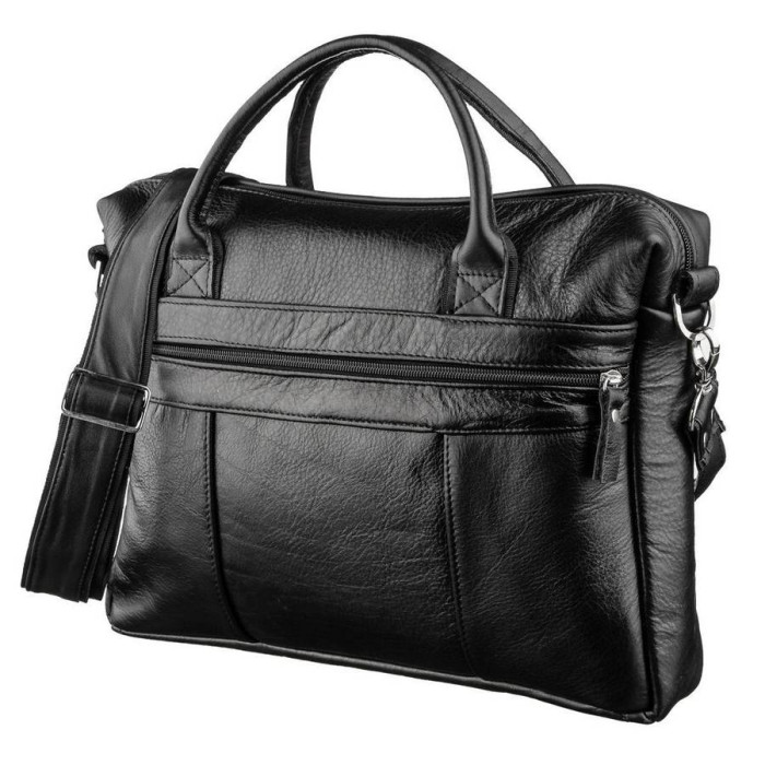 Практична чоловіча сумка з натуральної гладкої шкіри м'якої на дотик, чорного кольору. За рахунок того що шкіра м'яка на ній можуть з'являтися складочки, що істотно 100% натуральній шкірі. В сумку поміститься ноутбук діагоналлю 14 дюймів або папка з документами. Сумку можна переносити в руці за допомогою зручних шкіряних ручок, а також через плече (в комплекті є, регульований плечовий ремінь, який виконаний в комбінації текстильного матеріалу та натуральної шкіри). Доповнена сумка міцною фурнітурою кольору срібла.