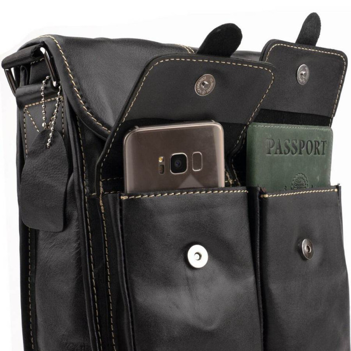 Містка сумка для справжніх чоловіків в гладенькій шкірі чорного кольору. Сумка має особливий дизайн, який виділить вас з натовпу і додасть більше строгості і солідності вашому стилю. Сумка доповнена якісною фурнітурою. Дизайн самої моделі продуманий до всіх дрібниць. Аксесуар упакований в тканинний чохол. Така сумка стане найпрекраснішим подарунком для будь-якого чоловіка. Зверніть увагу, що сумка виконана в глянцевій блискучій гладкій шкірі.