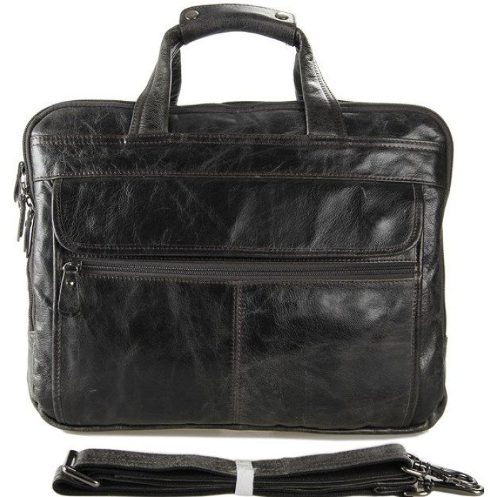 Сумку можна носити в руці за допомогою шкіряних ручок, а також через плече, в комплекті плечовий ремінь, що знімається, з поєднання міцного текстилю та шкіри. Аксесуар прошитий міцною ниткою, що надає виробу міцності і оригінального вигляду. Аксесуар закривається на блискавку. На лицевій стороні, під клапаном на магнітах, розташовано дві кишені, одна з них на блискавці. На задній зовнішній стороні знаходиться відділення на блискавці. Підкладка виконана з міцного текстильного матеріалу чорного кольору. Такий шкіряний аксесуар стане чудовим подарунком улюбленому чоловікові, синові, батькові або керівнику.