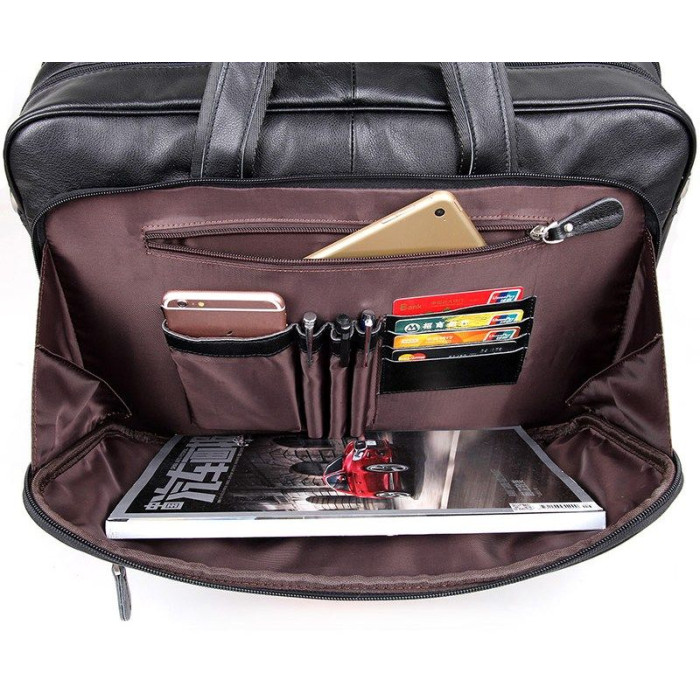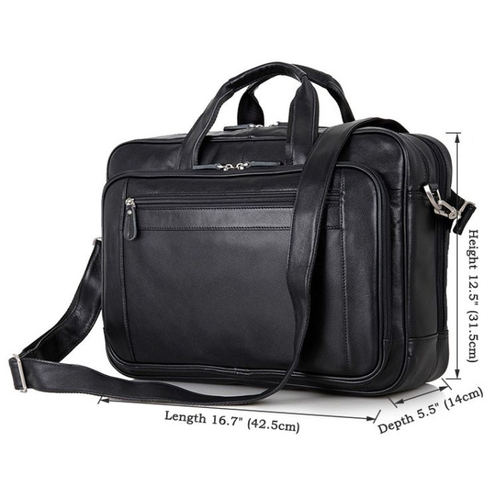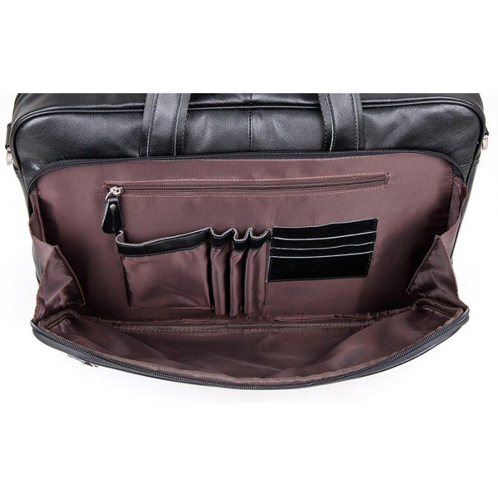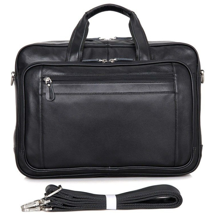 Елітна чоловіча сумка для ноутбука до 17-ти дюймів. Аксесуар виконаний з натуральної високоякісної шкіри чорного кольору. Колір фурнітури: срібло. Переносити дану модель можна в руці, або через плече (в комплекті є регульований плечовий ремінь). На лицевій стороні розташована потайна кишеня на блискавці, а також величезне відділення на блискавці в якому Ви знайдете: