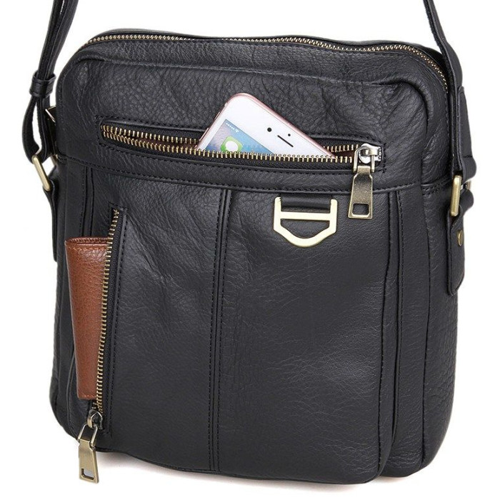 Добротна чоловіча сумка через плече з натуральної шкіри. Колір фурнітури: латунь. Сумка акуратно прошита міцною ниткою чорного кольору. На лицевій стороні розташовано два відділення на блискавці. Ще одне відділення на блискавці розташоване на задній зовнішній стороні. Дана модель закривається за допомогою блискавки. Сумка упакована в текстильний пилозахисний чохол білого кольору.