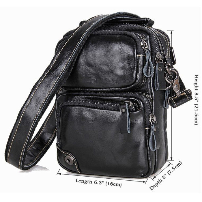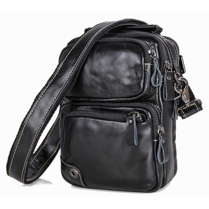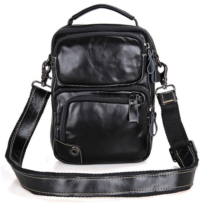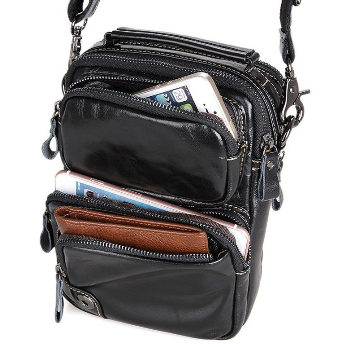Ексклюзивна чоловіча сумка з безліччю кишень і відділень. Аксесуар виконаний з натуральної високоякісної шкіри приємної на дотик. Сумка має досить компактні розміри, але при цьому вона досить вмістка. Шкіра відрізняється легким блиском. Колір фурнітури: темне срібло. Сумку можна переносити в руці за допомогою шкіряною ручки, а також через плече (в комплекті є регульований плечовий ремінь). Аксесуар упакований в текстильний пилозахисний мішечок.