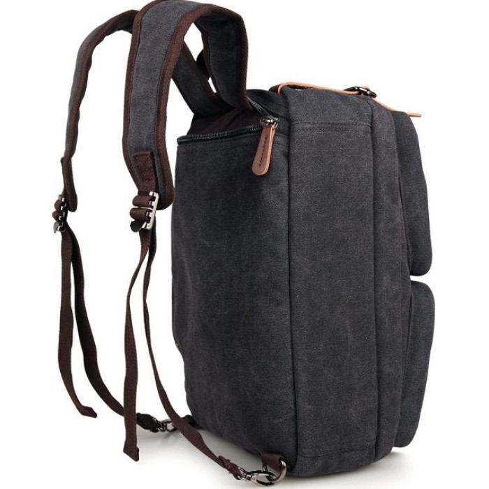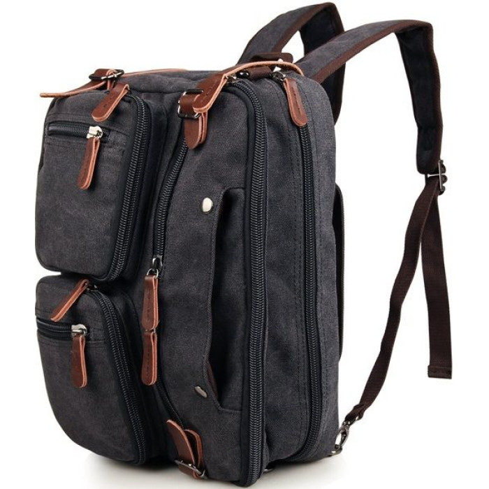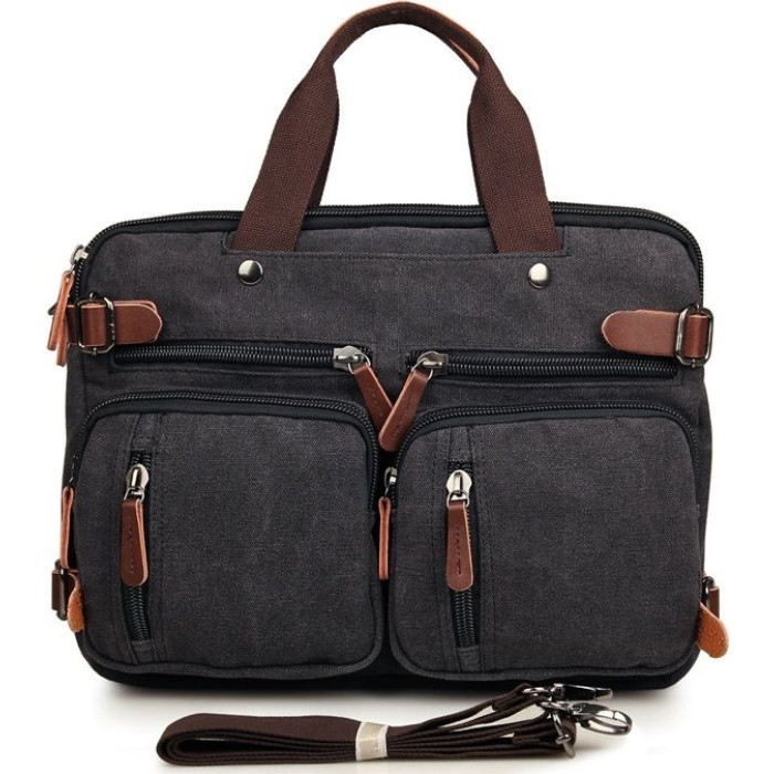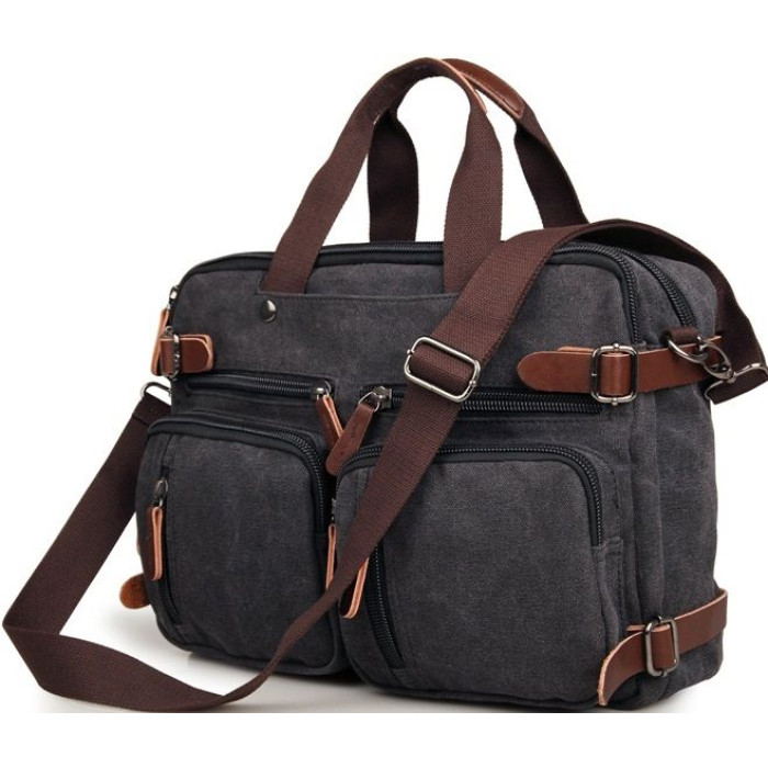 Містка чоловіча сумка-трансформер з міцної тканини. Виріб складається з двох великих відділень, які закриваються на надійні товсті блискавки. У першому відділенні знаходиться відділення з м'якою перегородкою для 15-дюймового ноутбука, а також потайна кишенька на змійці. У другому відділенні дві невеликі кишені під гаманець і телефон.