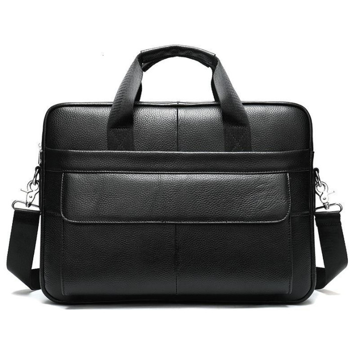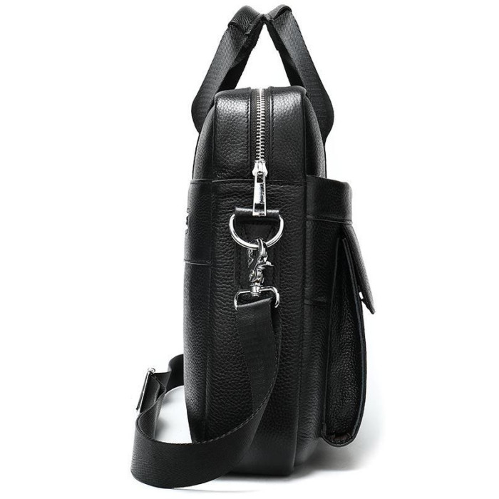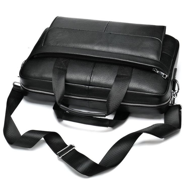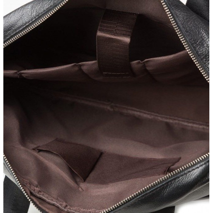 Вмістка чоловіча сумка з відділенням для невеликого ноутбука 15 дюймів, а також документів формату А4. Аксесуар виконаний з натуральної зернистої шкіри чорного кольору. На лицевій стороні даного виробу розташовані два вмістких відділення, одне під клапаном на магнітах, інше на блискавці. На задній зовнішній стороні знаходиться ще одне відділення на блискавці. Сумку можна переносити в руці за допомогою зручних шкіряно-текстильних ручок, а також через плече (в комплекті є регульований плечовий ремінь, який виконаний з текстильного матеріалу). Колір фурнітури: срібло.