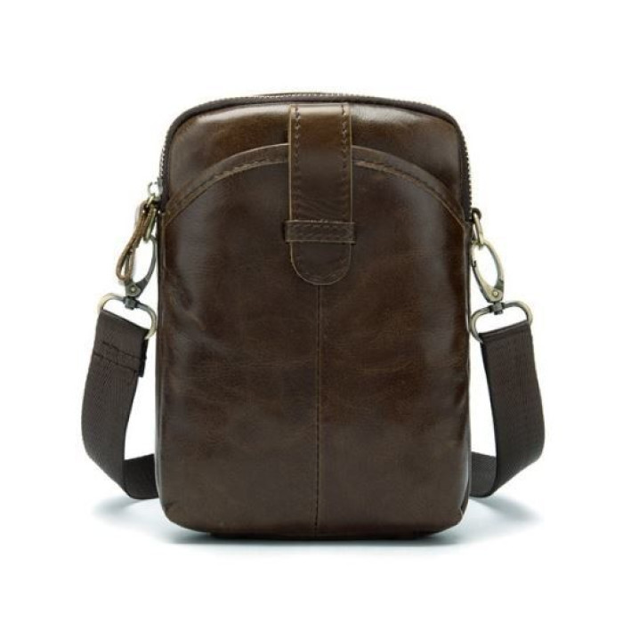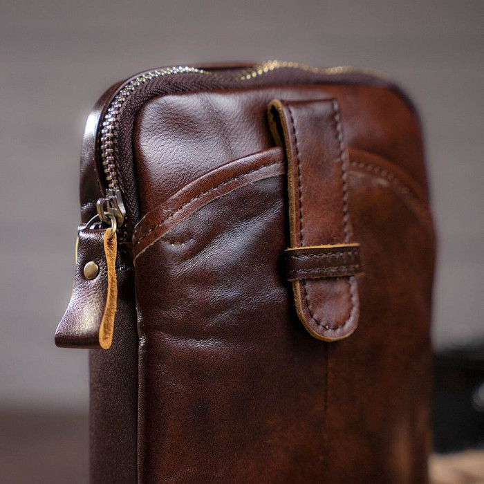 Компактна сумка для чоловіків на кожен день. По краях аксесуар прошитий коричневою ниткою. Всередині сумки міцна текстильна підкладка коричневого кольору. Особливістю такої шкіри є, то, що на ній не видно подряпин і зносу. Ви будете приємно здивовані, адже сумка довго буде носитися. Може бути прекрасним варіантом для подарунка кожному чоловіку.