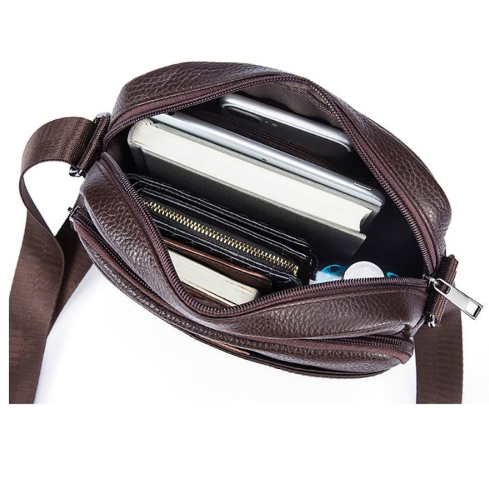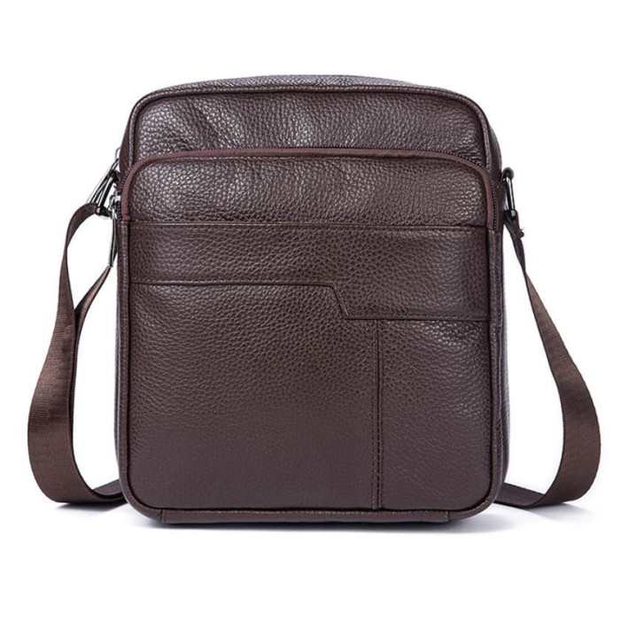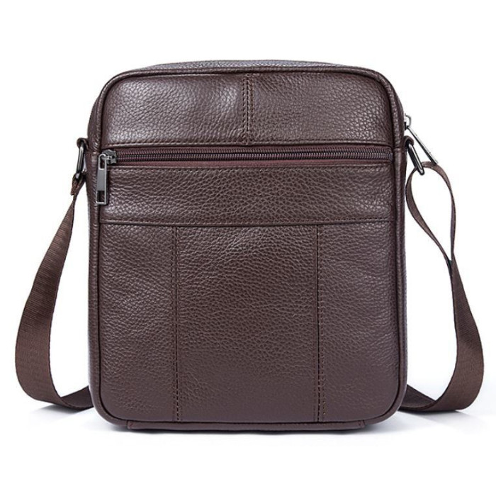 Гарна компактна сумка з натуральної шкіри високої якості. По краях аксесуар прошитий коричневою ниткою. Модель доповнена фурнітурою кольору темного металу. Оптимальний варіант для тих, хто любить маленькі компактні сумочки і вважає за краще, щоб все було під рукою. Буде ідеальним подарунком для стильного і солідного чоловіка.